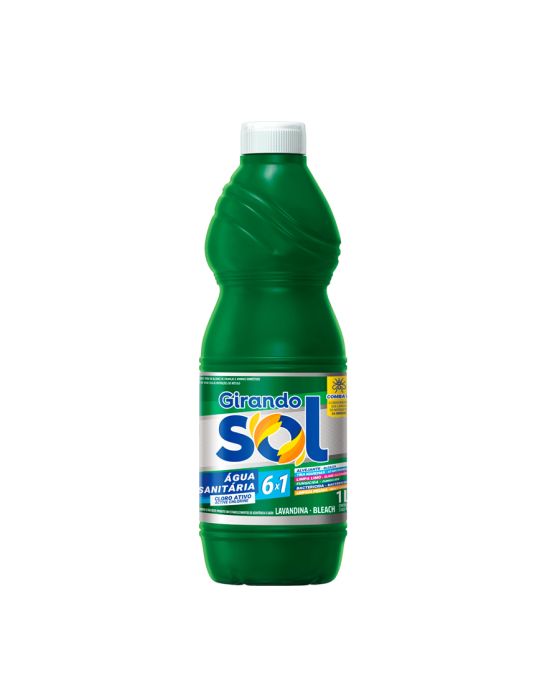Características:A água sanitária é o produto que não pode faltar no seu lar. É eficiente na limpeza e ainda ajuda a tirar manchas. De uma vez só você pode lavar roupas claras, remover manchas difíceis e ainda limpar ralos e banheiros.Detalhes:- Marca: Girando Sol.- Linha: Água Sanitária.- Volume: 1 Litro.- Contém: 1 unidade do produto.- 6 em 1.- Com cloro ativo.- Combate o crescimento de larvas e mosquitos da Dengue.6x1:- Alvejante.- Tira Manchas.- Limpa Limo.- Fungicida.- Bactericida.- Limpeza Pesada.Cuidados - Manter fora do alcance de crianças e animais domésticos. - Evitar o contato com os olhos, pele e roupas durante a manipulação. - Produto irritante para os olhos e a pele, não inalar. - Não ingerir o produto. - Não misturar com água na embalagem original. - Mantenha o produto no frasco original, manter o frasco protegido do sol e do calor. - Não utilizar o frasco vazio para outros fins. - Em caso de contato com a pele ou com os olhos, lave com água corrente em abundância, por pelo menos 15 minutos. - Em caso de ingestão, não provoque vômito e consulte imediatamente o Centro de Intoxicações ou o seu médico, levando o rótulo do produto.Composição Química - Composição: Hipoclorito de Sódio 2% à 2,5% p/p de cloro ativo, Hidróxido de Sódio, Carbonato de Cálcio e água. - Princípio Ativo: Hipoclorito de Sódio.ATENÇÃO: CONSERVE FORA DO ALCANCE DAS CRIANÇAS E ANIMAIS DOMÉSTICOS!NÃO MISTURAR COM PRODUTOS À BASE DE AMÔNIA. EM CONTATO COM ÁCIDOS E METAIS, LIBERA GASES TÓXICOS* As especificações podem ser alteradas sem aviso prévio ** Imagem meramente ilustrativa