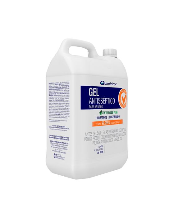 Caracteristicas:O Álcool Gel Antisséptico 70%, fabricado pela Quimidrol, é um gel antisséptico indicado para a proteção e o cuidado das mãos de maneira fácil e rápida. Prático, pode ser utilizado em diferentes ambientes que requeiram higienização eficiente. Sua fórmula elimina 99,9% das bactérias.Detalhes:- Marca: Quimidrol.- Linha: Álcool em gel.- Cor: Incolor.- Volume: 5,1 Litros.- Peso: 4,31Kg.- Álcool Etílico: 70°INPM.- Contém: 1 unidade do produto.- Testado dermatologicamente.- Contém Aloe Vera.- Hidratante Glicerinado.- Higienizante, sem enxágue de rápida absorção.- Elimina 99,999% das bactérias.- Gel antisséptico para as mãos.Prazo de validade: 24 meses após a data de fabricação (Vide embalagem).Indicação: - Como antisséptico para uso institucional e em serviços de saúde.Modo de usar:- Coloque uma pequena quantidade na palma da sua mão, esfregue e deixe secar.Composição: - Alcohol, Aqua, Glycerin, Isopropyl Alcohol, Acrylic Acid, Propylene Glycol, Aloe Barbadensis Extract, Ethanolamine, Denatonium Benzoate.* Bactérias testadas: Pseudomonas aeruginosa, Salmonella choleraesuis e Staphylococcus aureus.Precauções:- Não ingerir, evite a inalação ou aspiração e contato com os olhos.- Não utilizar para desinfecção de alimentos.- Em caso de ingestão acidental, procure um médico imediatamente.Conservação:- Manter afastado do fogo e do calor.- Armazenar em local fresco, ao abrigo do calor e do sol.- Manter o produto em sua embalage original, não reutilizar as embalagens.- Não misturar com outros produtos.ATENÇÃO! CONSERVE FORA DO ALCANCE DAS CRIANÇAS E DOS ANIMAIS DOMÉSTICOS.PERIGO: PRODUTO INFLAMÁVEL.** Antes de usar, leia as instruções do rótulo!* As especificações podem ser alteradas sem aviso prévio ** Imagem meramente ilustrativa