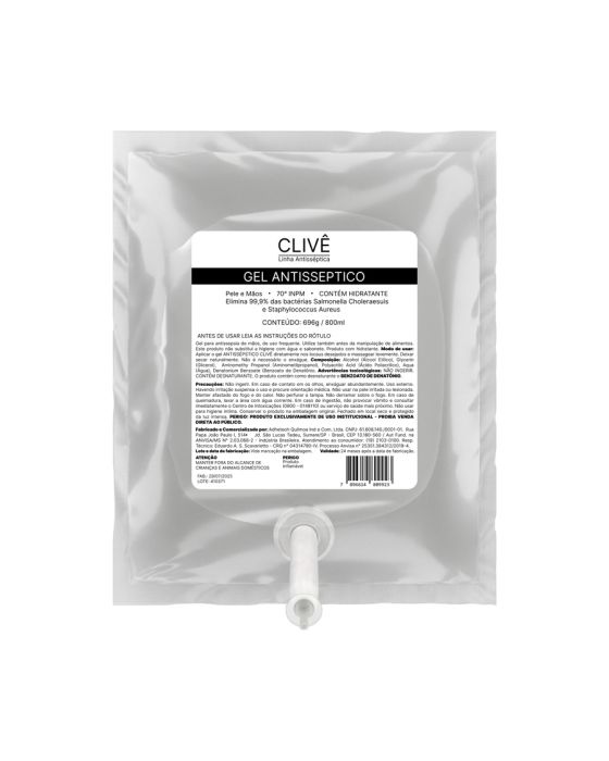 Características:- Higienização segura e eficaz das mãos em ambientes profissionais: O Álcool Gel Antisséptico 70% Clivê 800ml Refil é uma solução desenvolvida para garantir proteção antimicrobiana eficaz em locais que exigem alto padrão de higiene e segurança. Sua formulação contém álcool etílico 70° INPM, proporcionando eliminação comprovada de 99,9% das bactérias, incluindo Salmonella entérica e Staphylococcus aureus. Ideal para uso frequente, promove antissepsia imediata das mãos sem necessidade de enxágue, assegurando praticidade e eficiência nas rotinas corporativas.- Formulação balanceada com ação hidratante: Com composição técnica à base de álcool etílico, glicerol, aminometilpropanol, ácido poliacrílico, água e benzoato de denatônio, o Clivê Gel Antisséptico alia ação bactericida de alta performance a agentes emolientes que preservam a hidratação natural da pele, evitando o ressecamento mesmo em uso contínuo. Sua textura leve e secagem rápida permitem aplicação uniforme, deixando uma sensação agradável e não pegajosa.- Aplicação prática e versátil: Recomendado para ambientes corporativos, comerciais e industriais, o Álcool Gel Clivê 70% é amplamente utilizado em escritórios, hospitais, clínicas, restaurantes, cozinhas industriais, escolas, recepções e áreas de circulação intensa. O formato refil de 800ml é ideal para dispensers de parede ou totens, otimizando o consumo e reduzindo o descarte de embalagens.- Eficiência e segurança em higienização profissional: O produto é indicado também antes da manipulação de alimentos e em locais onde o contato manual é constante. Sua ação rápida elimina micro-organismos sem agredir a pele, garantindo higienização eficaz, prática e segura. Ressalta-se que o produto não substitui a lavagem tradicional com água e sabonete, sendo uma solução complementar indispensável em procedimentos de higiene preventiva.- Compromisso de qualidade Clivê: A Clivê é uma marca reconhecida no segmento de higiene profissional e institucional, com foco em produtos de alta eficiência e segurança dermatológica.- Dimensões do produto: Comprimento: 14,5cm; Largura: 10cm; Altura: 9,5cm; Peso: 752g. IMPORTANTE! CONSERVAR FORA DO ALCANCE DAS CRIANÇAS E DOS ANIMAIS DOMÉSTICOS.* As especificações podem ser alteradas sem aviso prévio ** Imagem meramente ilustrativa.