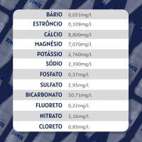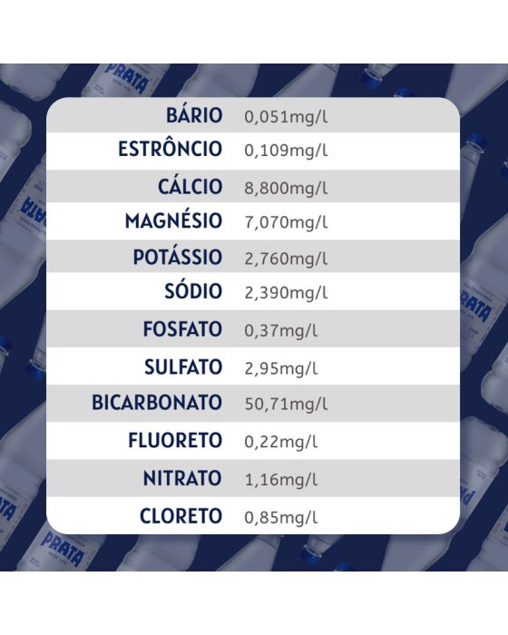 Caracteristícas:A Água Mineral Natural Prata 370ml é sua dose diária de hidratação, ideal para compartilhar! Água 100% natural extraída da Serra da Mantiqueira, rica em sais minerais naturais, bicarbonatada, leve e com baixo teor de sódio. Tradição de mais de 140 anos de nossa Fonte Leve que é referência de pureza, frescor e qualidade.Detalhes:- Marca: Prata.- Linha: Água Mineral.- Tipo: Sem gás.- Volume: 370ml.- Contém: 1 embalagem com 12 unidades do produto.- Validade: 12 Meses após data de envase indicada na garrafa.Especificações: - pH a 25°C: 6,49.- Temperatura da água na fonte 22,3°C.- Condutividade a 25°C: 76,7 µS/cm.- Resíduo de evaporação a 180°C, calculado: 73,47 mg/L.- Radioatividade na Fonte a 20°C e 760 mm de Hg: 23,08 maches.Composição Química (mg/l):- Bário: 0,051, Estrôncio: 0,109, Cálcio: 8,800, Magnésio: 4,070, Potássio: 2,760, Sódio: 2,390, Fosfato: 0,37, Sulfato: 2,95, Bicarbonato: 50,71, Fluoreto: 0,22, Nitrato: 1,16 e Cloreto: 0,85.Conservação:- Manter em lugar seco, limpo e arejado. Livre de odores e protegido da luz solar.NÃO CONTÉM GLÚTEN.* As especificações podem ser alteradas sem aviso prévio ** Imagem meramente ilustrativa.