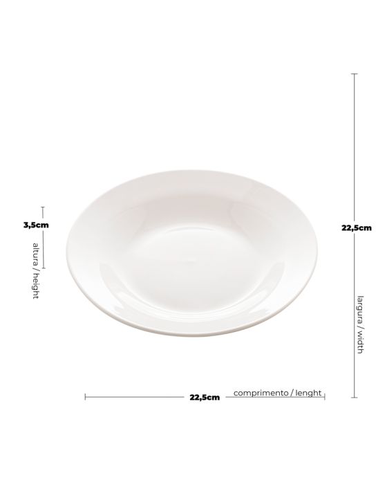 Características:- Design minimalista e funcional para uso diário: O prato fundo Clean da Lyor é uma peça versátil e elegante, ideal para uso residencial ou profissional em restaurantes, hotéis e buffets. Com acabamento branco e formato limpo, seu design minimalista valoriza a apresentação dos alimentos e se adapta facilmente a diferentes estilos de composição à mesa.- Versatilidade de uso e praticidade na rotina: Com 23 cm de diâmetro útil, este prato fundo é ideal para servir porções generosas de sopas, massas, risotos, ensopados ou cereais. Sua profundidade moderada permite o uso em refeições líquidas ou semi-líquidas, garantindo praticidade e boa retenção do conteúdo servido.- Composição em porcelana de alta qualidade: Produzido em porcelana branca de alta resistência, o modelo Clean combina durabilidade com acabamento refinado. É indicado para uso diário, com superfície vitrificada que mantém o brilho e facilita a higienização. Para preservar sua integridade, recomenda-se a lavagem manual com detergente neutro e esponja macia, evitando o uso de produtos abrasivos ou máquinas lava-louças.- Aplicações recomendadas: Indicado para cozinhas domésticas ou profissionais, o prato fundo Clean pode ser utilizado em almoços, jantares e eventos, compondo mesas formais ou informais com equilíbrio estético e funcionalidade. Ideal para composições monocromáticas ou como base neutra para louças coloridas.- Lyor: Reconhecida no segmento de utilidades domésticas, a Lyor oferece produtos com ótimo padrão de acabamento, estética moderna e bom desempenho para uso cotidiano.- Dimensões do produto:Comprimento: 23,5cm;Largura: 23,5cm;Altura: 3cm;Peso: 458g.* As especificações podem ser alteradas sem aviso prévio ** Imagem meramente ilustrativa.