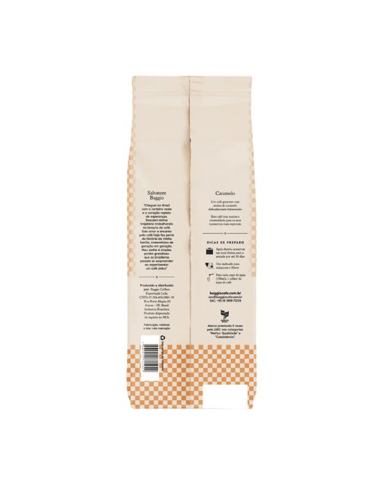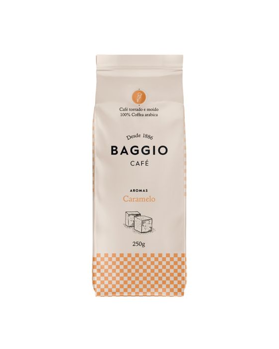 Características:O café aromatizado Baggio Caramelo é uma excelente escolha para quem gosta de cafés naturalmente adocicados. Esse café oferece intensidade média, baixa acidez, o que realça seu corpo prolongado.Ao experimentar Baggio Caramelo, você perceberá um sabor marcante que pode ser apreciado a cada gole.Detalhes:- Marca: Baggio Cafés;- Linha: Cafés;- Sabor: Caramelo;- Tipo: Moído;- Peso: 250g;- Itensidade: 07;- Origem: Mogiana Paulista e sul de Minas Gerais;- Contém: 1 unidade do produto;- Compatibilidade: Ideal para metódos de preparo com cafés torrados e moídos, como cafeteira italiana, filtros, prensa francesa, aeropress, espressos, coados, entre outros;- Experiência sensorial única e agradável;- Textura encorpada e aveludada;- Tipo de grão: 100% Arábica.Corpo: - Aroma: Caramelo;- Notas: Caramelizadas e vibrantes;- Harmoniza com: Café coados, leites, cappuccinos;- Moagem: Média;- Torra: Média;- Bebida: Mole.Dicas de preparo:- Após aberto, conservar em local fresco, seco e arejado por até 30 dias;- Uso indicado para máquinas e filtros;- Para cada copo de água (150ml), 1 colher de sopa de café.Ingredientes:- Café torrado moído e aromatizantes.ALÉRGICOS: NÃO CONTÉM LACTOSE. NÃO CONTÉM GLÚTEN. NÃO CONTÉM AÇÚCAR. NÃO CONTÉM LEITE E DERIVADOS. * As especificações podem ser alteradas sem aviso prévio ** Imagem meramente ilustrativa.