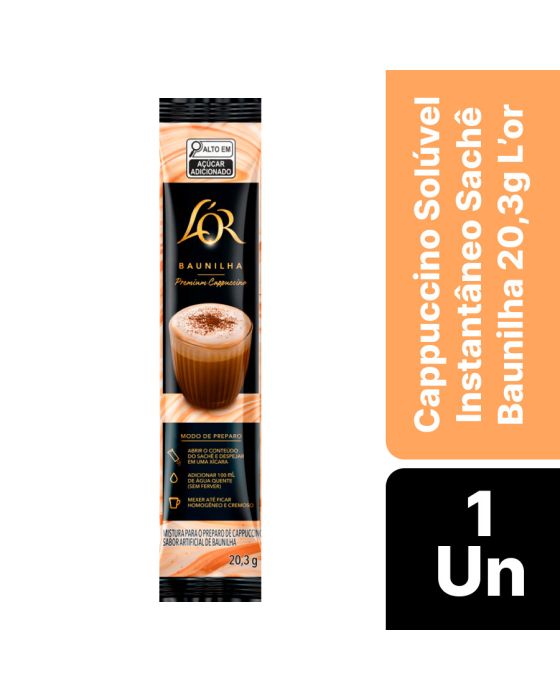 Características:Cada detalhe foi cuidadosamente elaborado pelos artistas do Café L’OR, que desenvolveram uma receita exclusiva no Brasil com Café L’OR premium e a cremosidade do leite vaporizado, proporcionando uma deliciosa camada de espuma cremosa e uma bebida encorpada com sabor equilibrado e incrivelmente aromática, atendendo aos paladares mais exigentes. Basta adicionar água ou leite quente para apreciar um momento de prazer em qualquer lugar.Detalhes:- Marca: L'or;- Modelo: Premium Cappuccino;;- Tipo: Solúvel instantâneo;- Tipo de embalagem: Sachê;- Sabor: Baunilha;- Peso: 20,3g;- Contém: 1 unidade do produto de 20,3g;- Preparo fácil e rápido;- Cremoso.Fabricado na República Tcheca.Ideal para:- Refeitórios corporativos, hotéis, lojas, clínicas de saúde, odontológicas e de estética, empresas que comercializam cestas de café da manhã e demais comércios que dispõe de cafés especiais aos seus clientes.Modo de preparo:- Abrir o conteúdo do sachê e despejar em uma xícara;- Adicionar 100ml de água quente (sem ferver);- Mexer até ficar homogêneo e cremoso.Conservação:- Manter em local seco e fresco;- Após aberto, consumir todo o conteúdo do sachê.Ingredientes:- Açúcar, xarope de glucose, leite em pó desnatado, maltrodextrina, óleo vegetal de palmiste, café solúvel em pó, sal, amido modificado, caseinato e sódio, aromatizantes, antiumectante (INS 551), estabilizante (INS 340), espessante (INS 415) e emulsificantes (INS 481).Medidas:- Dimensões do produto: 15,5 x 3,5 x 1,5cm (CxLxA);- Peso: 20,3g.ALÉRGICOS:CONTÉM LEITE E DERIVADOS. PODE CONTER DERIVADOS DE SOJA.NÃO CONTÉM GLÚTEN. CONTÉM LACTOSE. ALTO EM AÇÚCAR ADICIONADO.* As especificações podem ser alteradas sem aviso prévio ** Imagem meramente ilustrativa.