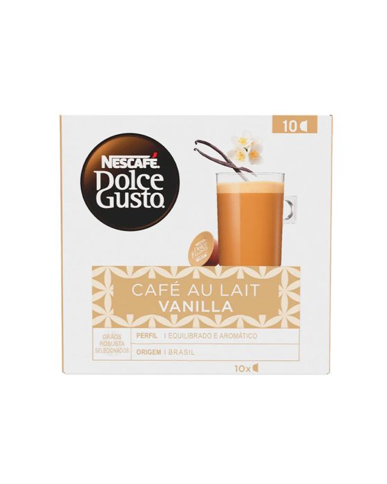 Características:O Café Au Lait que você já conhece e ama, agora com um sabor especial. A combinação entre café Robusta e leite integral ganha um aroma de baunilha, para deixar esse clássico ainda mais surpreendente.Detalhes:- Marca: Nescafé® Dolce Gusto®.- Linha: Cápsula.- Sabor: Café Au Lait Vanilla.- Tipo: Bebida Gelada.- Perfil: Equilibrado e Aromático.- Origem: Brasil.- Contém: 1 caixa com 10 unidades.- Quantidade: Cápsula 11g cada.- Peso da embalagem: 110g.- Compatibilidade: Máquinas Dolce Gusto® Geração 1.Indústria Brasileira.Cápsulas:- Quantidade de Cápsulas: 10 cápsulas.- Rendimento: 10 porções.- Porção: 11g (1 cápsula).Faz:- Cada cápsula faz: 110ml.- Tamanho de xícara: Média.Ingredientes:- Leite em pó integral, Açúcar, Café Solúvel (15%), Soro de leite, Aromatizante, Estabilizantes Fosfato Dipotássico e Citrato de Sódio e Emulsificante Lecitina de Soja.Armazenagem:- Manter em local fresco e arejado.Recicle:- Se você tem acesso a coleta seletiva, descarte junto aos materiais recicláveis.- Caso não tenha, encontre o ponto de entrega mais próximo de você: https://www.nescafe-dolcegusto.com.br/sustentabilidadendgALÉRGICOS: CONTÉM DERIVADOS DE LEITE E SOJA. PODE CONTER TRIGO, CEVADA E AVEIA.CONTÉM LACTOSE. CONTÉM GLÚTEN.* As especificações podem ser alteradas sem aviso prévio ** Imagem meramente ilustrativa.