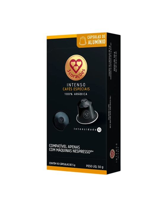 Características:Blend preparado com cafés Arábica cultivados na região do Cerrado Mineiro em Minas Gerais. Um espresso de alta intensidade e encorpado, com sabor de chocolate amargo, acidez média alta e finalizações intensas e de longa duração. Compatíveis apenas com o sistema Nespresso, as cápsulas compatíveis Nespresso da marca 3 Corações Inteso são ideais para quem busca qualidade e intensidade com a confiança do grupo 3Corações, especialista em cafés no Brasil.Detalhes:- Marca: Três Corações;- Sabor: Intenso;- Tipo: Espresso;- Linha: Cápsula de Café;- Peso: 50g;- Contém: 1 embalagem com 10 cápsulas de 5g cada.- Compatível com: Nespresso®*;- Intensidade: 10;- Cápsula de alumínio;- 100% Arábica.Indústria Brasileira.Perfil Aromático:- Torra: Escura;- Origem: Cerrado Mineiro e Espírito Santo;- Notas: Chocolate amargo;- Aroma: Intenso;- Acidez: Média alta.Notas Aromáticas:- Notas: Torradas e de chocolate amargo.Faz:- Espresso: 40ml.Ingredientes:- Café torrado e moído.Conservação:- Conservar em local seco, fresco e inodoro.Medidas:- Dimensões da embalagem: 15,5 x 7,8 x 3cm (CxLxA);- Peso: 50g. * As novas cápsulas Três Corações são compatíveis APENAS com as máquinas Nespresso®.ATENÇÃO: NÃO CONTÉM GLÚTEN.*Nespresso® é uma marca registrada pela Société des Produits Nestlé S.A. e este produto não é afiliado ou aprovado pela Nestlé S.A.**As especificações podem ser alteradas sem aviso prévio *** Imagem meramente ilustrativa.