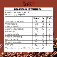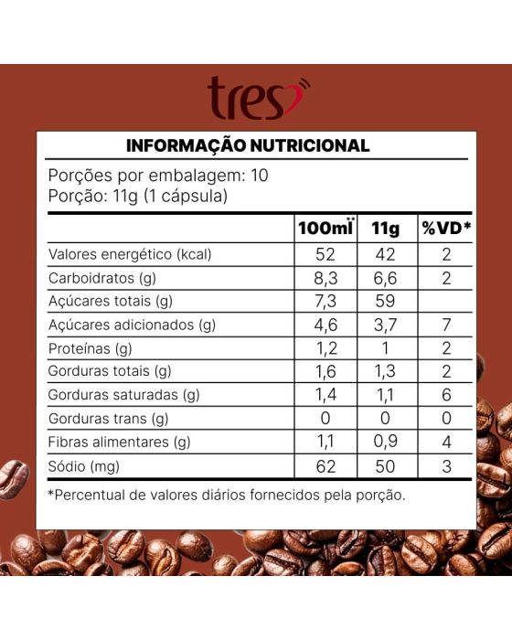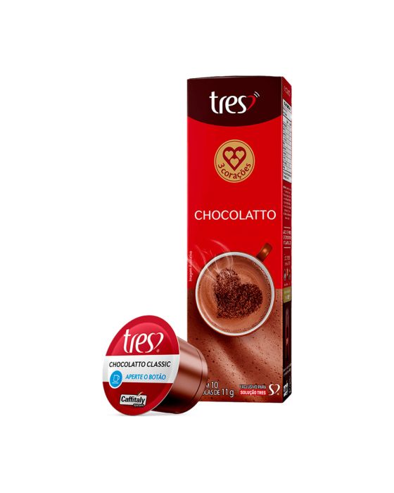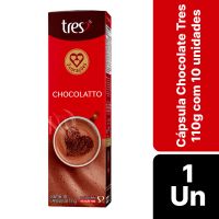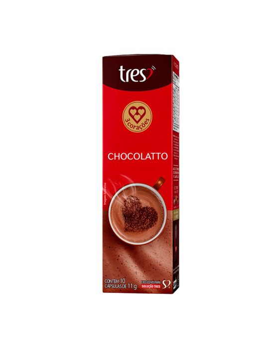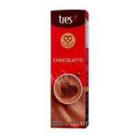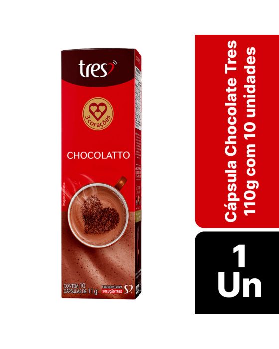 Características:Desperte seus sentidos com o Chocolatto em cápsula Tres 3 Corações, uma bebida cremosa e irresistível com o sabor intenso do chocolate, levemente adocicado. Feito com cacau de alta qualidade, esse Chocolate Quente é perfeito para os amantes de Bebidas Doces e de Sabor e Qualidade. Experimente e descubra por que quem prova o Chocolatto TRES® 3 Corações nunca mais quer outra opção! Detalhes:- Marca: Três Corações;- Linha: Cápsulas;- Sabor: Chocolatto;- Perfil: Cremoso;- Origem: Brasil;- Contém: 1 caixa com 10 unidades.- Quantidade: cada cápsula contém 10g;- Peso da embalagem: 110g;- Compatibilidade: Para uso exclusivo nas máquinas Três®.Indústria Brasileira.Cápsulas:- Quantidade de Cápsulas: 10 cápsulas.- Rendimento: 10 porções.- Porção: 11g.Faz:- Cada cápsula faz: 80ml.Conservação:- Conservar em local seco, fresco e inodoro.Ingredientes:- Açúcar, cacau em pó, soro de leite em pó, gordura de coco totalmente hidrogenada, dextrose, xarope de glicose, leite em pó desnatado, sal, caseinato de sódio, regulador de acidez fosfato dipotássico, emulsificante mono e diglicerídeos de ácidos graxos, espessante goma xantana, antiumectante dióxido de silício, aromatizante e edulcorante sucralose.Recicle:- Encontre o ponto de entrega mais próximo de você: https://www.escolhatres.com.br/reciclagem/.Medidas:- Dimensões do produto: 19,5 x 5,9 x 4,8cm (CxLxA);- Peso: 110g.ALÉRGICOS: CONTÉM DERIVADOS DE LEITE. PODE CONTER SOJA.CONTÉM LACTOSE. CONTÉM GLÚTEN.* As especificações podem ser alteradas sem aviso prévio ** Imagem meramente ilustrativa.
