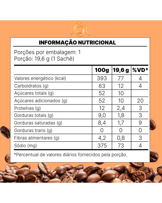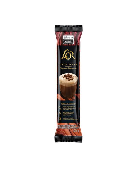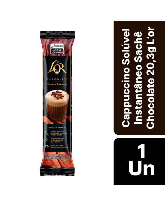 Características:Cada detalhe foi cuidadosamente elaborado pelos artistas do Café L’OR, que desenvolveram uma receita exclusiva no Brasil com Café L’OR premium e a cremosidade do leite vaporizado, proporcionando uma deliciosa camada de espuma cremosa e uma bebida encorpada com sabor equilibrado e incrivelmente aromática, atendendo aos paladares mais exigentes. Basta adicionar água ou leite quente para apreciar um momento de prazer em qualquer lugar.Detalhes:- Marca: L'or;- Modelo: Premium Cappuccino;- Tipo: Solúvel instantâneo;- Tipo de embalagem: Sachê;- Sabor: Chocolate;- Peso: 19,6g;- Contém: 1 unidade do produto de 19,6g;- Preparo fácil e rápido;- Cremoso.Fabricado na República Tcheca.Ideal para:- Refeitórios corporativos, hotéis, lojas, clínicas de saúde, odontológicas e de estética, empresas que comercializam cestas de café da manhã e demais comércios que dispõe de cafés especiais aos seus clientes.Modo de preparo:- Abrir o conteúdo do sachê e despejar em uma xícara;- Adicionar 100ml de água quente (sem ferver);- Mexer até ficar homogêneo e cremoso.Conservação:- Manter em local seco e fresco;- Após aberto, consumir todo o conteúdo do sachê.Ingredientes:- Açúcar, leite em pó desnatado, café solúvel em pó, gordura vegetal hidrogenada de coco, xarope de glucose, cacau em pó, maltrodextrina, caseinato de sódio, amido modificado, estabilizante (INS 340 e INS 452), emulsificantes (INS 481), aromatizantes, antiumectante (INS 551) e espessante (INS 415)Medidas:- Dimensões do produto: 15,5 x 3,5 x 1,5cm (CxLxA);- Peso: 19,6g.ALÉRGICOS:CONTÉM LEITE E DERIVADOS.NÃO CONTÉM GLÚTEN. CONTÉM LACTOSE. ALTO EM AÇÚCAR ADICIONADO.* As especificações podem ser alteradas sem aviso prévio ** Imagem meramente ilustrativa.