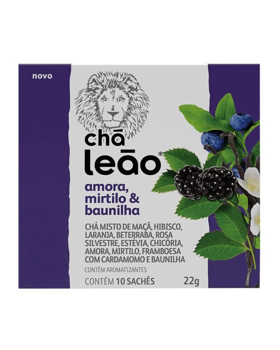 Características:A linha de Frutas e Flores da Leão possui a combinação de aromas e sabores, pensados especialmente para quem gosta de ter uma experiência diferente na hora de beber seu chá!.#FicadeBoa com Chás Leão!Detalhes:- Marca: Leão;- Linha: Chás;- Modelo: Amora, Mirtilo e Baunilha;- Sabor: Chá misto de maçã, Hibisco, Laranja, Beterraba, Rosa silvestre, Estévia, Chicória, Amora, Mirtilo, Framboesa com cardamomo e Baunilha;- Peso: 22g;- Quantidade de sachês: 10 sachês;- Sachês: 2,2g cada envelope;- Contém: 1 caixa com 10 unidades do produto;- Os chás não possuem quantidade significativa de valor energético, proteínas, gorduras totais, gorduras saturadas, gorduras trans, fibra alimentar e sódio.- Chás são envelopados individualmente.Indústria Brasileira. | Validade: 18 meses após a data de fabricação.Ideal para:- Ideal para o café da manhã, tarde, ou intervalos, pode ser usado em refeitórios corporativos, restaurantes de hotéis, escolas, hospitais e clínicas.Modo de preparo:- Despeje água quente (a 90ºC) em uma xícara de 240ml;- Coloque o sachê e deixe em infusão em 5 minutos;- Adoce se preferir;- Após o preparo, consumir imediatamente.Armazenamento:- Conservar ao abrigo do Sol e Calor em local limpo, seco, arejado e sem odor.Importante!- Utilize água filtrada;- Consumir imediatamente após preparo ou guardar por no máximo 8 horas em recipiente limpo e sob refrigeração;- Usar a quantidade indicada de água é importante para garantir uma melhor experiência.Ingredientes:- FRUTOS DE MAÇÃ (Pyrus malus L.), FLORES DE HIBISCO (Hibiscus sabdariffa L.), FRUTOS DE ROSA SILVESTRE (Rosa canina L.), CASCAS DE LARANJA DOCE (Citrus aurantium L.), RAÍZES DE BETERRABA (Beta vulgaris L.), FOLHAS DE ESTÉVIA (Stevia rebaudiana Bert), RAÍZES DE CHICÓRIA TOSTADA (Chicorium intybus L.) E AROMATIZANTES.Medidas:- Dimensões da embalagem: 7,8 x 7,2 x 8cm (CxLxA);- Peso: 35g.ALÉRGICOS: NÃO CONTÉM GLUTÉN.ATENÇÃO! MANTENHA FORA DO ALCANCE DE CRIANÇAS E DOS ANIMAIS DOMÉSTICOS.* As especificações podem ser alteradas sem aviso prévio ** Imagem meramente ilustrativa.