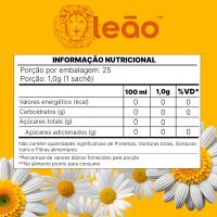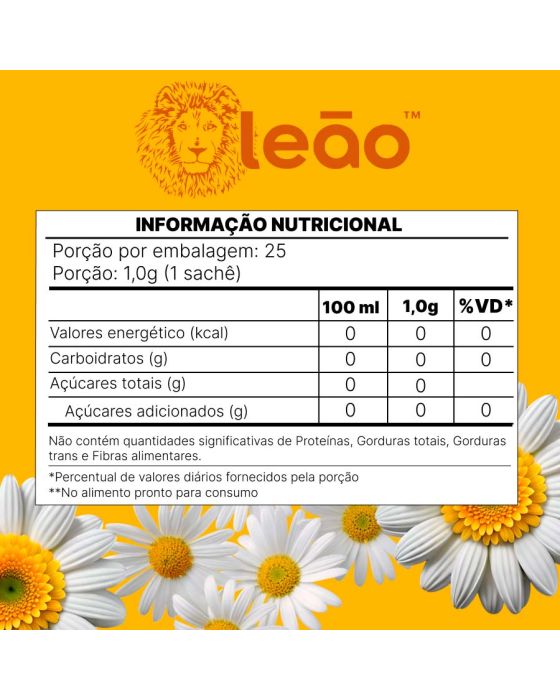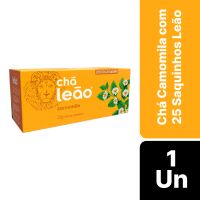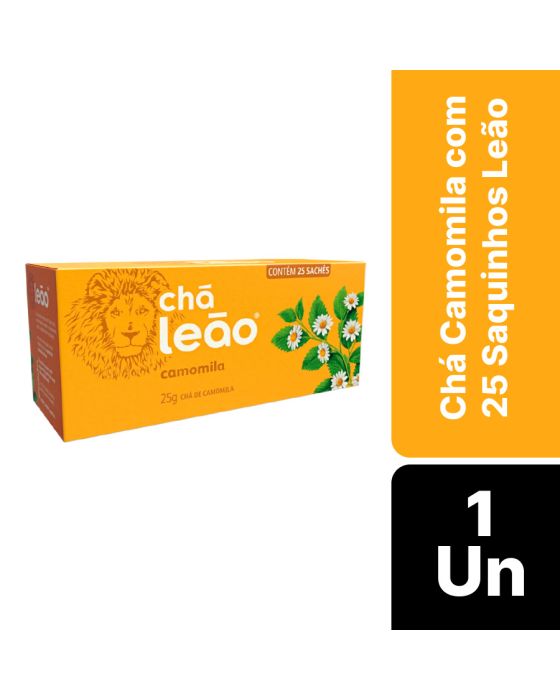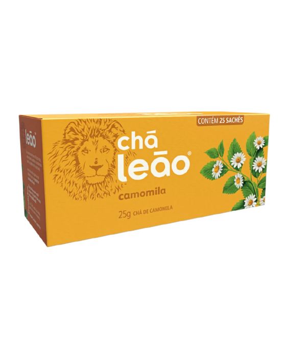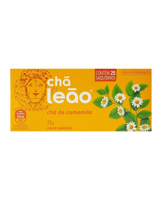 Características:A família de Ervas que todo mundo conhece com a qualidade de Leão, marca líder do segmento de chás, sinônimo de tradição e qualidade com mais de 120 anos de experiência.Inspire, Expire, Aprecie...#FicaDeBoaDetalhes:- Marca: Leão;- Linha: Chás;- Sabor: Camomila;- Peso: 25g;- Quantidade de sachês: 25 sachês;- Sachês: 2,0g cada envelope;- Contém: 1 caixa com 25 unidades do produto;- Não possui sódio, cafeína e mate;- Os chás não possuem quantidade significativa de valor energético, proteínas, gorduras totais, gorduras saturadas, gorduras trans, fibra alimentar e sódio.- Não embalados individualmente.Indústria Brasileira. | Validade: Aproximadamente 17 meses após a data de fabricação.Ideal para:- Ideal para o café da manhã, tarde, ou intervalos, pode ser usado em refeitórios corporativos, restaurantes de hotéis, escolas, hospitais e clínicas.Modo de preparo:- Despeje água quente (a 90ºC) em uma xícara de 240ml;- Coloque o sachê e deixe em infusão em 5 minutos;- Adoce se preferir;- Após o preparo, consumir imediatamente.Armazenamento:- Conservar ao abrigo do Sol e Calor em local limpo, seco, arejado e sem odor.Importante!- Utilize água filtrada;- Consumir imediatamente após preparo ou guardar por no máximo 8 horas em recipiente limpo e sob refrigeração;- Usar a quantidade indicada de água é importante para garantir uma melhor experiência.Ingredientes:- Capítulos Florais de Camomila (Matricaria recutita L.).Medidas:- Dimensões da embalagem: 13,2 x 5 x 5,8cm (CxLxA);- Peso: 48g.ALÉRGICOS: NÃO CONTÉM GLUTÉN.ATENÇÃO! MANTENHA FORA DO ALCANCE DE CRIANÇAS E DOS ANIMAIS DOMÉSTICOS.* As especificações podem ser alteradas sem aviso prévio ** Imagem meramente ilustrativa.