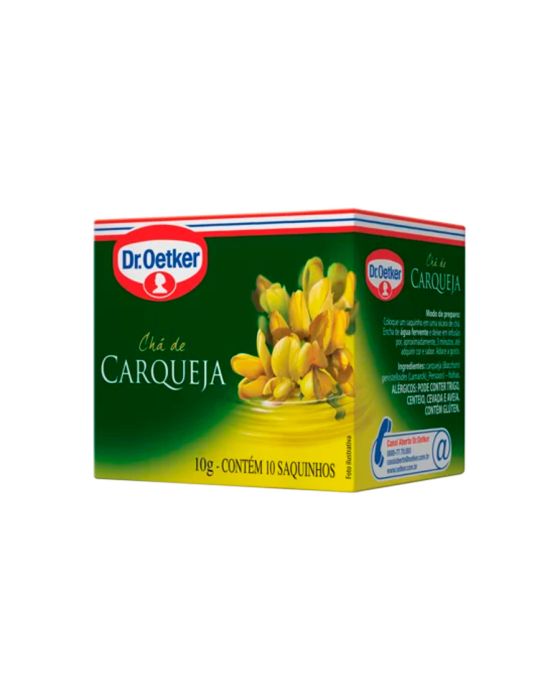 Caracteristicas:Infusões que preservam os benefícios naturais de cada planta. Um encontro com a natureza para ser apreciado a qualquer hora do dia.Detalhes:- Marca: Dr.Oetker.- Sabor: Carqueja.- Linha: Chá.- Peso líquido: 10g.- Embalagem com 10 saquinhos.Ingredientes:- Carqueja (Baccharis genistelloides (Lamarck)_Persoon) - folhasModo de preparo: - Coloque um saquinho em uma xícara de chá.- Encha de água fervente e deixe em infusão, por aproximadamente, 3 minutos, até adquirir cor e sabor.- Adoce a gosto.Conservação: - Armazenar em local fresco e seco e livre de odores fortes e estranhos.ALÉRGICOS: Dada a possibilidade de alterações de ingredientes, sempre considere a lista de alergênicos que consta na embalagem adquirida.Este produto pode conter: Pode conter trigo, centeio, cevada e aveia.* As especificações podem ser alteradas sem aviso prévio ** Imagem meramente ilustrativa.