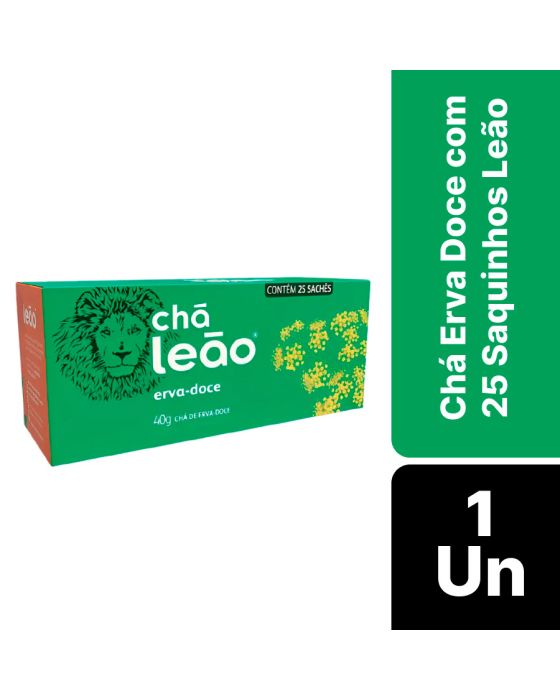 Características:A família de Ervas que todo mundo conhece com a qualidade de Leão, marca líder do segmento de chás, sinônimo de tradição e qualidade com mais de 120 anos de experiência.Inspire, Expire, Aprecie...#FicaDeBoaDetalhes:- Marca: Leão;- Linha: Chás;- Sabor: Erva Doce;- Peso: 25g;- Quantidade de sachês: 25 sachês;- Sachês: 2,0g cada envelope;- Contém: 1 caixa com 25 unidades do produto;- Não possui sódio, cafeína e mate;- Os chás não possuem quantidade significativa de valor energético, proteínas, gorduras totais, gorduras saturadas, gorduras trans, fibra alimentar e sódio.- Não embalados individualmente.Indústria Brasileira. | Validade: Aproximadamente 17 meses após a data de fabricação.Ideal para:- Ideal para o café da manhã, tarde, ou intervalos, pode ser usado em refeitórios corporativos, restaurantes de hotéis, escolas, hospitais e clínicas.Modo de preparo:- Despeje água quente (a 90ºC) em uma xícara de 240ml;- Coloque o sachê e deixe em infusão em 5 minutos;- Adoce se preferir;- Após o preparo, consumir imediatamente.Armazenamento:- Conservar ao abrigo do Sol e Calor em local limpo, seco, arejado e sem odor.Importante!- Utilize água filtrada;- Consumir imediatamente após preparo ou guardar por no máximo 8 horas em recipiente limpo e sob refrigeração;- Usar a quantidade indicada de água é importante para garantir uma melhor experiência.Ingredientes:- Frutos de Erva Doce (Pimpienella ansisum L.).Medidas:- Dimensões da embalagem: 13,2 x 5 x 5,8cm (CxLxA);- Peso: 48g.ALÉRGICOS: NÃO CONTÉM GLUTÉN.ATENÇÃO! MANTENHA FORA DO ALCANCE DE CRIANÇAS E DOS ANIMAIS DOMÉSTICOS.As especificações podem ser alteradas sem aviso prévio ** Imagem meramente ilustrativa.