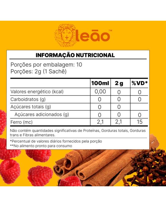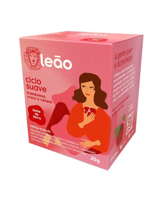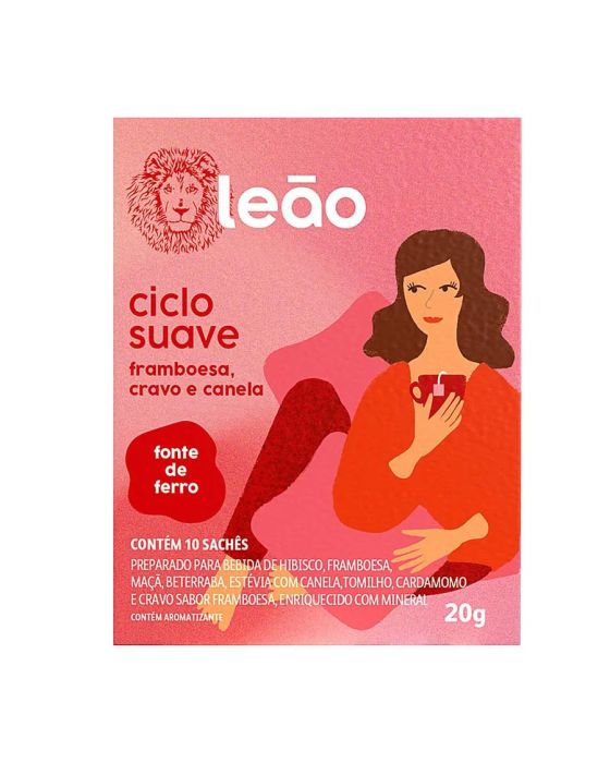 Características:Você não está sozinha!A Leão lança uma linha focada no autocuidado feminino, entregando uma nova experiência de consumo para todas as fases da vida das mulheres.A Gente quer aconchego!A Leão criou uma bebida para te acompanhar, com leveza e suavidade, durante o seu ciclo mentrual. Além disso, é fonte de ferro, tudo isso para você viver a sua liberdade, sempre!Este é o momento para cuidar de você.Detalhes:- Marca: Leão;- Linha: Chás;- Modelo: Ciclo Suave;- Aroma: Framboesa, Cravo e Canela;- Sabor: Preparado para bebida de Hibisco, Framboesa, Maça, Beterraba, Estévia com Canela, Tomilho, Cardamomo e chavo sabor framboesa, enriquecido com mineral;- Peso: 20g;- Quantidade de sachês: 10 sachês;- Sachês: 2g cada envelope;- Contém: 1 caixa com 10 unidades do produto;- Fonte de ferro;- Os chás não possuem quantidade significativa de valor energético, proteínas, gorduras totais, gorduras saturadas, gorduras trans, fibra alimentar e sódio.- Chás são envelopados individualmente.Indústria Brasileira. | Validade: Aproximadamente 14 meses após a data de fabricação.Ideal para:- Ideal para o café da manhã, tarde, ou intervalos, pode ser usado em refeitórios corporativos, restaurantes de hotéis, escolas, hospitais e clínicas.Modo de preparo:- Despeje água quente (a 90ºC) em uma xícara de 240ml;- Coloque o sachê e deixe em infusão em 5 minutos;- Adoce se preferir;- Após o preparo, consumir imediatamente.Armazenamento:- Conservar ao abrigo do Sol e Calor em local limpo, seco, arejado e sem odor.Importante!- Utilize água filtrada;- Consumir imediatamente após preparo ou guardar por no máximo 8 horas em recipiente limpo e sob refrigeração;- Usar a quantidade indicada de água é importante para garantir uma melhor experiência.Ingredientes:- Hibisco, Flores de Framboesa, Maçã, Canela, Beterraba, Tomilho, Cardamomo, Estévia, Gluconato de Ferro, Cravo, Framboesa, Aromatizantes.Medidas:- Dimensões da embalagem: 7,3 x 8 x 9,5cm (CxLxA);- Peso: 44g.ALÉRGICOS: NÃO CONTÉM GLUTÉN.ATENÇÃO! MANTENHA FORA DO ALCANCE DE CRIANÇAS E DOS ANIMAIS DOMÉSTICOS.* As especificações podem ser alteradas sem aviso prévio ** Imagem meramente ilustrativa.