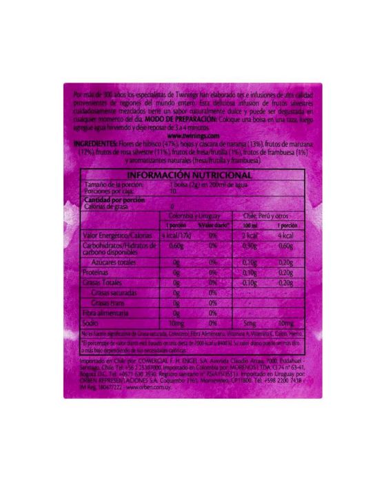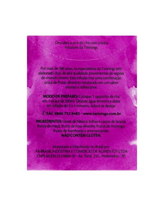 Características:Uma das infusões mais queridas de Twinings pelos brasileiros, este blend traz uma combinação exclusiva de frutas e flores do campo. Laranja, maçã, morango e framboesa unem-se ao hibisco e à rosa-silvestre para criar um sabor frutado intenso e surpreendente.- Peso: 20g- Contém 10 sachês- Não contém cafeínaIngredientes: Flores de hibisco, folhas e cascas de laranja, frutos de maçã, frutos de rosa-silvestre, frutos de morango, frutos de framboesa e aromatizantes. NÃO CONTÉM GLÚTEN.* As especificações podem ser alteradas sem aviso prévio** Imagem meramente ilustrativa.
