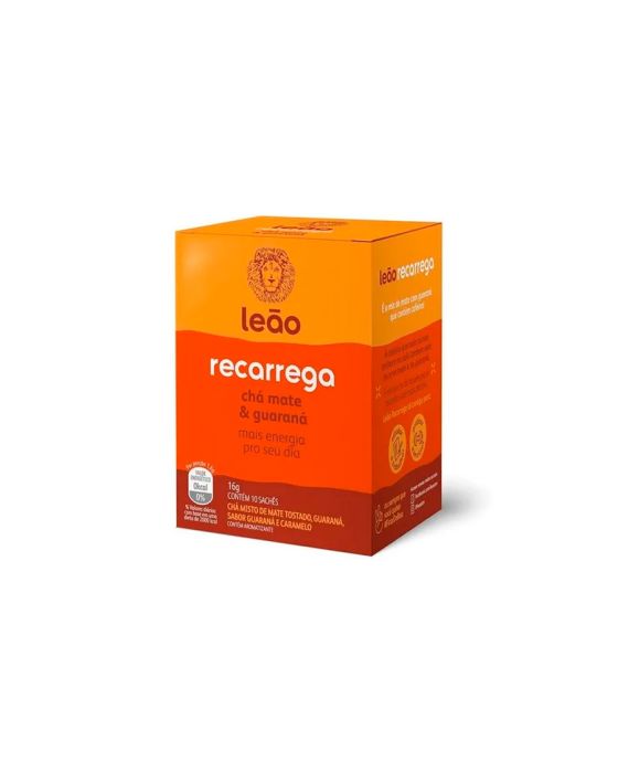 Características:Leão recarrega é o mix de mate com guaraná que contém cafeína! A cafeína que todo mundo conhece no café também está na erva mate e no guaraná. É ela que te dá aquele pique quando você mais precisa.Leão recarrega tá contigo para estudar, trabalhar e praticar exercícios.Detalhes:- Marca: Leão;- Modelo: Recarrega;- Linha: Chás Funcionais;- Sabor: Chá mate e guaraná;- Peso: 16g;- Quantidade: 10 sachês envelopados de 1,6g cada;- Contém: 1 caixa com 10 sachês de 1,6g cada;- Os chás não possuem quantidade significativa de valor energético, proteinas, gorduras totais, gorduras saturadas, gorduras trans, fibra alimentar e sódio;- Não contém cafeína;- Não contém mate;- Não contém Sódio;- Baixa caloria.Modo de Preparo:- Coloque 1 sachê em 240ml de quente (90°C);- Em 5 minutos já está pronto;- Após o preparo, consumir imediatamente;- Se preferir, adoce.Ingredientes: - Folhas de mate tostado (ilex paraguariensis St. Hil.), sementes de guaraná (paullinia cupana L.), aromatizantes.ALÉRGICOS: NÃO CONTÉM GLÚTEN.* As especificações podem ser alteradas sem aviso prévio ** Imagem meramente ilustrativa.