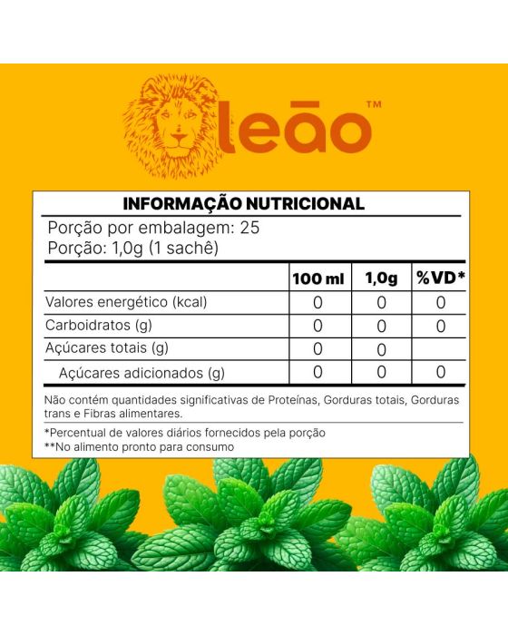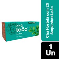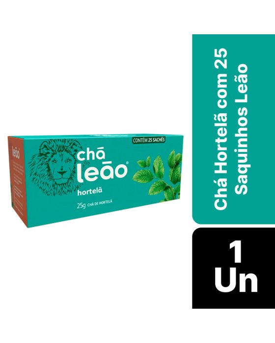 Características:A família de Ervas que todo mundo conhece com a qualidade de Leão, marca líder do segmento de chás, sinônimo de tradição e qualidade com mais de 120 anos de experiência.Inspire, Expire, Aprecie...#FicaDeBoaDetalhes:- Marca: Leão;- Linha: Chás;- Sabor: Hortelã;- Peso: 25g;- Quantidade de sachês: 25 sachês;- Sachês: 2,0g cada envelope;- Contém: 1 caixa com 25 unidades do produto;- Não possui sódio, cafeína e mate;- Os chás não possuem quantidade significativa de valor energético, proteínas, gorduras totais, gorduras saturadas, gorduras trans, fibra alimentar e sódio.- Não embalados individualmente.Indústria Brasileira. | Validade: 17 meses após a data de fabricação.Ideal para:- Ideal para o café da manhã, tarde, ou intervalos, pode ser usado em refeitórios corporativos, restaurantes de hotéis, escolas, hospitais e clínicas.Modo de preparo:- Despeje água quente (a 90ºC) em uma xícara de 240ml;- Coloque o sachê e deixe em infusão em 5 minutos;- Adoce se preferir;- Após o preparo, consumir imediatamente.Armazenamento:- Conservar ao abrigo do Sol e Calor em local limpo, seco, arejado e sem odor.Importante!- Utilize água filtrada;- Consumir imediatamente após preparo ou guardar por no máximo 8 horas em recipiente limpo e sob refrigeração;- Usar a quantidade indicada de água é importante para garantir uma melhor experiência.Ingredientes:- Folhas e Ramos de Hortelã (Mentha piperita. L).Medidas:- Dimensões da embalagem: 13,2 x 5 x 5,8cm (CxLxA);- Peso: 44g.ALÉRGICOS: NÃO CONTÉM GLUTÉN.ATENÇÃO! MANTENHA FORA DO ALCANCE DE CRIANÇAS E DOS ANIMAIS DOMÉSTICOS.* As especificações podem ser alteradas sem aviso prévio ** Imagem meramente ilustrativa.