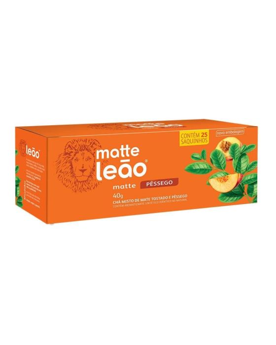 Caracteristicas:Matte Leão Pêssego tem sabor de Brasil. É preparado a partir das folhas da erva-mate, planta nativa, especialmente selecionadas e tostadas para resultar em uma bebida revigorante, saborosa, de característica única e inigualável. Tome emprestada toda a delicadeza e suavidade encontradas no pêssego e obtenha a equilibrada harmonia entre os sabores da erva e da fruta.Matte Leão, o autêntico sabor do mate, conecta você às raízes do Brasil.Detalhes:- Marca: Leão.- Sabor: Pêssego.- Linha: Chá.- Peso Caixa: 40g.- Embalagem com: 25 sachês.- Saquinhos: Cada saquinho tem 1,6g de chá cada.- Porção: Porção de 1,6g (1 sachê).- Os chás não possuem quantidade significativa de valor energético, carboidratos, proteínas, gorduras totais, gorduras saturadas, gorduras trans, fibra alimentar e sódio.- Chás NÃO são envelopados individualmente.- Ervas naturais.Ingredientes:- FOLHAS DE MATE TOSTADO (llex paraguariensis St. Hil), FRUTOS DE PÊSSEGO (Prunus persica (L.)Batsch) e AROMATIZANTE.Modo de prepraro:- Despeje água quente (a 90C) em uma xícara de 240ml.- Coloque o sachê e deixe em infusão em 5 minutos.- Adoce se preferir.- Após o preparo, consumir imediatamente.Conservação:- Conservar ao abrigo do Sol e Calor em local limpo, seco, arejado e sem odor.Importante!- Utilize água filtrada.- Consumir imediatamente após preparo ou guardar por no máximo 8 horas em recipiente limpo e sob refrigeração.- Usar a quantidade indicada de água é importante para garantir uma melhor experiência.- Não contém glúten.* As especificações podem ser alteradas sem aviso prévio ** Imagem meramente ilustrativa.