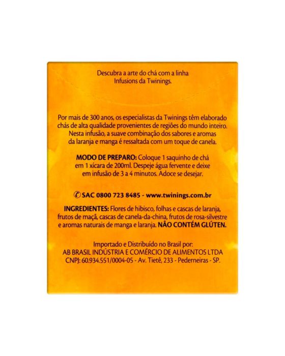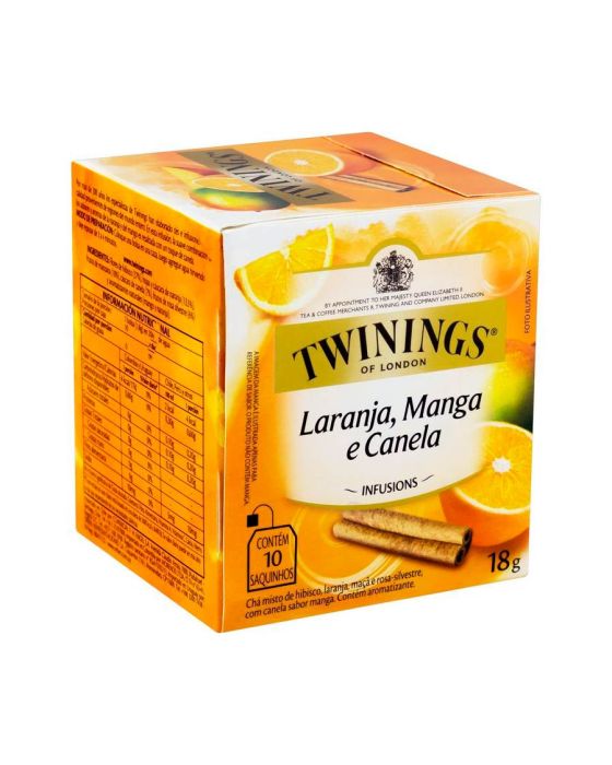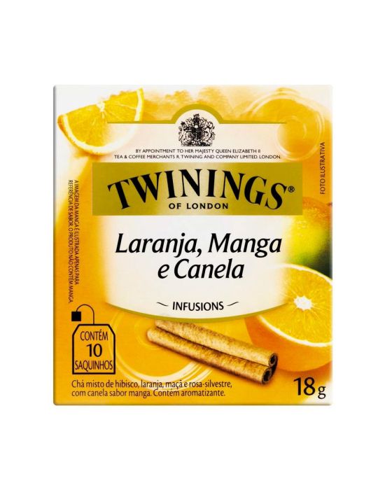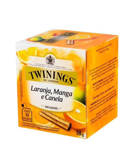 Características:Esta infusão é uma mistura inusitada do sabor cítrico da laranja com um fundo de manga e um toque de canela, resultando em um blend surpreendente e exclusivo de Twinings.- Peso: 18g- Contém 10 sachês- Não contém cafeínaIngredientes: Flores de hibisco, folhas e cascas de laranja, frutos de maçã, cascas de canela-da-china, frutos de rosa-silvestre e aromas naturais de manga e laranja. NÃO CONTÉM GLÚTEN.* As especificações podem ser alteradas sem aviso prévio** Imagem meramente ilustrativa.