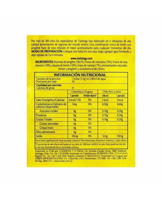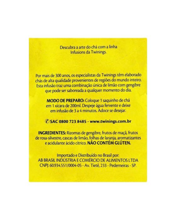 Características:Nós unimos dois dos ingredientes mais apreciados no mundo para criar nosso sabor mais vendido: o gengibre e o limão, trazendo esta infusão revigorante com um aroma cítrico e um sabor picante ao mesmo tempo.- Peso: 15g- Contém 10 sachês- Não contém cafeínaIngredientes: Rizomas de gengibre, frutos de maçã, frutos de rosa-silvestre, cascas de limão, folhas de laranja, aromatizantes e acidulante ácido cítrico. NÃO CONTÉM GLÚTEN.* As especificações podem ser alteradas sem aviso prévio** Imagem meramente ilustrativa.