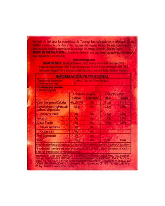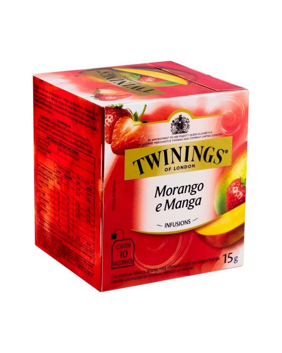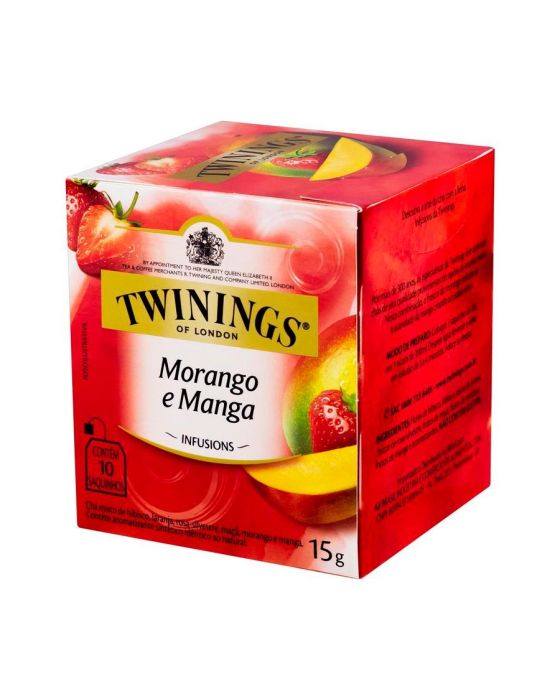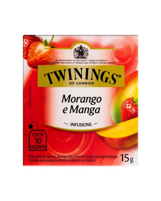 Características:Nesta infusão única da Twinings, o aroma marcante do morango mistura-se ao sabor suave e adocidado da manga, criando um sabor surpreendente ao paladar e perfeito para o clima brasileiro.- Peso: 15g- Contém 10 sachês- Não contém cafeínaIngredientes: Flores de hibisco, folhas e cascas de laranja, frutos de rosa-silvestre, frutos de maçã, frutos de morango, frutos de manga e aromatizante. NÃO CONTÉM GLÚTEN.* As especificações podem ser alteradas sem aviso prévio** Imagem meramente ilustrativa.