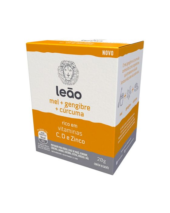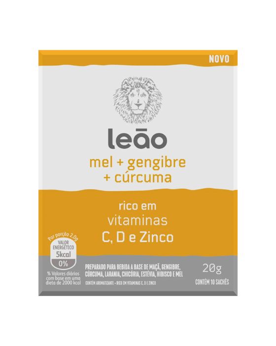 Características:A Leão juntou o poder da natureza com as vitaminas para criar uma bebida saborosa e funcional para todos que procuram uma rotina mais saudávelO mel, gengibre e cúrcuma são conhecidos como ingredientes que fortalecem a saúde. Juntos então, eles são poderosos.- Sabor: Mel, gengibre e cúrcuma- Contém 10 sachês envelopados de 2g cadaIngredientes: frutos de maçã, rizoma de gengibre, rizoma de cúrcuma, casca de laranja, raíz de chicória, glutonato de zinco, folhas de estévia, vitamina D, vitamina C, flories de hibisco, mel, aromatizante.NÃO CONTÉM GLÚTEN.Modo de Preparo:- Coloque 1 sachê em 240ml de quente (90°C)- Em 5 minutos já está pronto!- Após o preparo, consumir imediatamente* As especificações podem ser alteradas sem aviso prévio ** Imagem meramente ilustrativa.