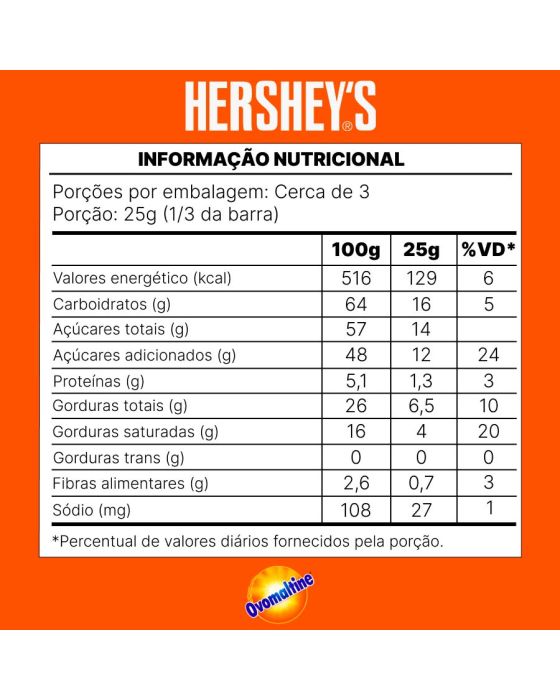 Características:- Barra de chocolate ao leite com crocância de Ovomaltine e formulação combinada: O Chocolate Barra Hershey’s Ovomaltine 77 g foi desenvolvido para unir a cremosidade do chocolate ao leite Hershey’s à textura crocante e ao sabor maltado característico do Ovomaltine. A combinação resulta em um perfil sensorial equilibrado, com contraste entre suavidade, dulçor e notas maltadas, garantindo experiência de consumo diferenciada e agradável.- Formato compacto e funcional para transporte e consumo diário: Com 77 g, a barra apresenta dimensões práticas e leves, permitindo transporte fácil em bolsas, mochilas ou kits de presente. Seu design segmentado facilita o fracionamento dos pedaços, oferecendo conveniência para consumo individual, compartilhado ou utilização parcial em receitas.- Textura crocante com sabor exclusivo Ovomaltine: A formulação inclui partículas crocantes de Ovomaltine distribuídas na massa do chocolate, proporcionando irregularidade proposital na textura, maior sensação de crocância e reforço do sabor característico do cereal maltado. A base ao leite confere equilíbrio, mantendo cremosidade e derretimento uniforme.- Indicado para lanches, sobremesas e composições gastronômicas: Versátil, o chocolate pode ser consumido puro, utilizado em sobremesas, incorporado a preparações como cookies, brownies e coberturas, além de ser ideal para montagem de cestas, presentes e composições temáticas gastronômicas. O perfil crocante agrega textura interessante a receitas e finalizações.- Sobre a marca Hershey’s: A Hershey’s é uma das maiores e mais tradicionais fabricantes de chocolate do mundo, com mais de 150 anos de história. - Ingredientes: Açúcar, Ovomaltine (Açúcar, extrato de cereal (cevada e malte), glucose, cacau em pó, sal, canela, emulsificante lecitina de soja, antiumectante fosfato ticálcico, regulador de acidez carbonato de sódio e aromatizante), massa de cacau, leite em pó integral, manteiga de cacau, gordura vegetal, permeado de soro de leite em pó, gordura anidra de elite, emulsificantes lecitina de soja e poligligerol polirricinoleato e aromatizante.- Informação nutricional e alergênicos:Contém glúten. Contém lactose.Alérgicos: Contém derivados de soja, leite e derivados. Pode conter trigo, centeio, amendoim, amêndoa, avelã, castanha-de-caju, castanha-do-pará, macadâmia, nozes e látex natural.- Dimensões da embalagem: Comprimento: 17cm; Largura: 7cm; Altura: 0,5cm; Peso: 77g.* As especificações podem ser alteradas sem aviso prévio ** Imagem meramente ilustrativa.