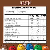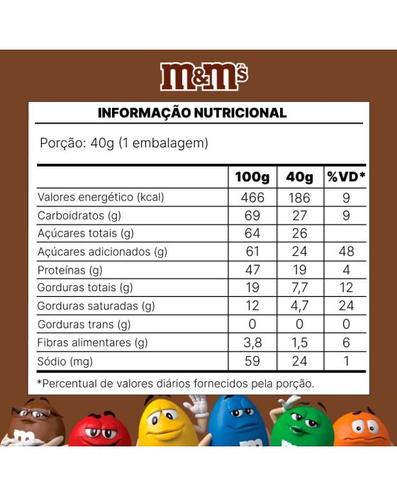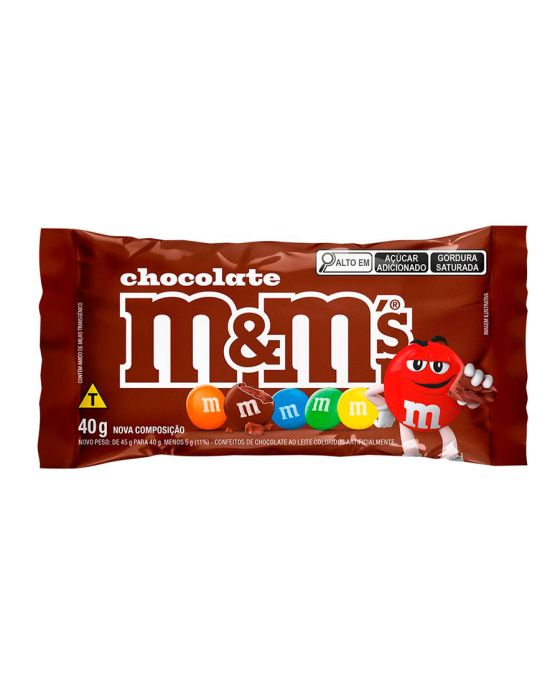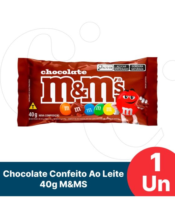Características:- Confeitos de chocolate ao leite com casquinha crocante colorida: O Chocolate Confeito ao Leite M&M’S 40g é composto por chocolate ao leite envolto por uma fina e crocante casquinha colorida, que ajuda a proteger o produto contra o derretimento e proporciona consumo mais prático. A combinação garante sabor equilibrado, textura agradável e padronização em cada unidade.- Variedade de cores e identidade visual marcante: Os confeitos apresentam seis cores diferentes e misturadas: amarelo, vermelho, verde, azul, laranja e marrom, que conferem forte apelo visual e tornam o produto atrativo para consumo individual ou para composição de ambientes com snacks e guloseimas.- Embalagem compacta para consumo individual: A embalagem de 40 g é ideal para consumo rápido e individual, sendo adequada para acompanhar momentos de lazer, como assistir a filmes com pipoca, ou para pequenas pausas ao longo do dia.- Aplicação versátil em ambientes comerciais e institucionais: Indicado para consumo direto, o M&M’S ao Leite pode ser servido em recepções de hotéis, clínicas, espaços para café e lanches, salas de reuniões e outros ambientes que disponibilizam doces e snacks aos clientes, visitantes ou colaboradores.- Sobre a marca M&M’S: A M&M’S é uma marca reconhecida mundialmente pela qualidade e inovação em chocolates confeitados.- Ingredientes: Açúcar, Amendoim, Massa de Cacau, Gordura Vegetal, Leite em Pó, Amido de Milho (agrobacterium tumefaciens, bacillus thuringiensis, streptomyces viridochromogenes, sphingobium herbicidorovans e zea mays), Gordura Láctea, Xarope de Glicose, Manteiga de Cacau, Sal, Dextrina, óleos Vegetais, Espessante Goma Arábica, Emulsificante Lectina de Soja e Poliglicerol Polirricinoleato, Corantes Dióxido de Titânio, Tartrazina, Amarelo Crepúsculo FCF, Vermelho Allura AC, Carbonato de Cálcio e Azul Brilhante FCF, Glaceante Cera Carnaúba e Aromatizante..- Informação nutricional e alergênicos:Contém glúten. Contém lactose.Alérgicos: Contém derivados de leite e soja. Pode conter amendoim, trigo, centeia, cevada e aveia.- Dimensões do produto: Comprimento: 10,5cm;Largura: 4,5cm;Altura: 18cm;Peso: 132g.* As especificações podem ser alteradas sem aviso prévio ** Imagem meramente ilustrativa.