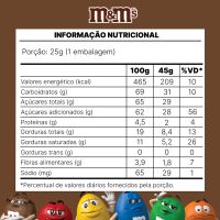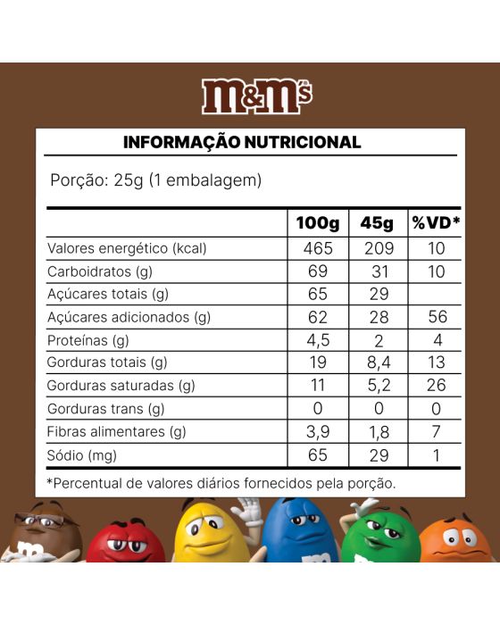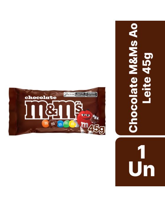 Características:Os deliciosos confeitos de M&M'S de chocolate ao leite, cobertos por uma fina e crocante casquinha colorida. São seis cores diferentes e misturadas: amarelo, vermelho, verde, azul, laranja e marrom. Essa embalagem de 45g tem o tamanho ideal para assistir um filme com pipoca e M&M'S.Detalhes:- Marca: M&Ms;- Fabricante: Mars;- Linha: Confeitos;- Tipo; Individual;- Tipo: Sache;- Sabor: Chocolate Ao Leite;- Volume: 45g;- Contém: 1 unidade do produto;- Com açúcar;- Nova composição.Indústria Brasileira.Ideal para:- Ideal para servir em recepções de hotéis, clínicas, salões de beleza, espaços para café e lanches, salas de reuniões e demais ambientes que possuem guloseimas.Conservação:- Mantenha em local seco, fresco e inodoro.Ingredientes: - Açúcar, Amendoim, Massa de Cacau, Gordura Vegetal, Leite em Pó, Amido de Milho (agrobacterium tumefaciens, bacillus thuringiensis, streptomyces viridochromogenes, sphingobium herbicidorovans e zea mays), Gordura Láctea, Xarope de Glicose, Manteiga de Cacau, Sal, Dextrina, óleos Vegetais, Espessante Goma Arábica, Emulsificante Lectina de Soja e Poliglicerol Polirricinoleato, Corantes Dióxido de Titânio, Tartrazina, Amarelo Crepúsculo FCF, Vermelho Allura AC, Carbonato de Cálcio e Azul Brilhante FCF, Glaceante Cera Carnaúba e Aromatizante.Medidas:- Dimensões do produto: 14,5 x 6,6 x 1,5- Peso: 45g.ALÉRGICOS: CONTÉM DERIVADOS DE LEITE E SOJA. PODE CONTER AMEMDOIM, TRIGO, CENTEIO, CEVADA E AVEIA. CONTÉM LACTOSE. CONTÉM GLÚTEN.* As especificações podem ser alteradas sem aviso prévio ** Imagem meramente ilustrativa.