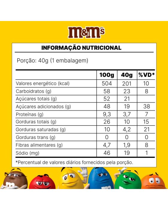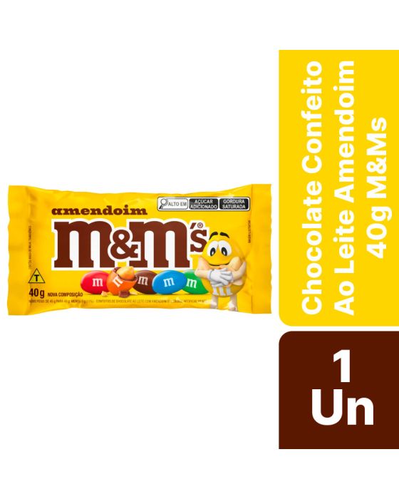 Características:- Sabor marcante e diversão em cada mordida: O Chocolate Confeito ao Leite com Amendoim M&M’S 40g oferece a combinação perfeita entre o sabor intenso do chocolate ao leite e o crocante do amendoim, tudo envolto em uma fina camada colorida de açúcar. Produzido com ingredientes selecionados e controle de qualidade rigoroso, é ideal para quem busca um doce prático, saboroso e irresistível.- Composição crocante e equilibrada: Cada unidade contém amendoins inteiros cobertos por chocolate ao leite cremoso, revestidos por uma casquinha crocante e colorida, que garante textura e sabor únicos a cada mordida.- Ideal para diferentes momentos e ambientes: Perfeito para servir em recepções de hotéis, clínicas, salões de beleza, espaços de café, escritórios e salas de reunião, o M&M’S Amendoim traz descontração e energia ao ambiente. Também é uma excelente opção para consumo individual, brindes corporativos ou composição de kits de hospitalidade.- Conservação e durabilidade: Para manter o sabor e a textura originais, recomenda-se armazenar em local fresco, seco e livre de odores fortes, longe da luz solar direta. O produto possui nova composição, desenvolvida para garantir o mesmo sabor marcante com ainda mais qualidade e estabilidade em diferentes condições de armazenamento.- M&M’S: diversão, cor e sabor em uma marca mundialmente reconhecida: Presente em mais de 100 países, a M&M’S é uma das marcas mais conhecidas da Mars Incorporated, sinônimo de diversão e qualidade em chocolates desde 1941.- Ingredientes: Açúcar, Amendoim, Massa de Cacau, Gordura Vegetal, Leite em Pó, Amido de Milho (agrobacterium tumefaciens, bacillus thuringiensis, streptomyces viridochromogenes, sphingobium herbicidorovans e zea mays), Lactose, Permeado de Soro de Leite em Pó, Gordura Láctea, Xarope de Glicose, Manteiga de Cacau, Dextrina, Sal, Óleos Vegetais, Espessante Goma Arábica, Emulsificantes Lectina de Soja e Poliglicerol Polirricinoleato, Corantes Dióxido de Titânio, Tartrazina, Amarelo Crepúsculo FCF, Vermelho Allura AC, Carbonato de Cálcio e Azul Brilhante, Glaceante Cera Carnaúba e Aromatizante.- Informação nutricional e alergênicos:Contém glúten. Contém Lactose.Alérgicos: Contém amendoim e derivados de leite e de soaja. Pode conter trigo, centeio, cevada e aveia,- Dimensões do produto:Comprimento: 15cm;Largura: 5cm;Altura: 2cm;Peso: 23g.* As especificações podem ser alteradas sem aviso prévio ** Imagem meramente ilustrativa.