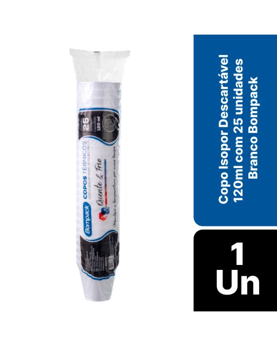 Características:Os Copos Térmicos Bompack de 120ml são a escolha perfeita para as necessidades de serviço de seu cliente. Com uma embalagem contendo 25 unidades, esses copos são ideais para servir bebidas quentes ou frias em eventos, festas ou estabelecimentos comerciais. Fabricados em poliestireno (PS) esses copos proporcionam uma experiência excepcional de consumo ao seu cliente, seja para café, sucos, ou outras bebidas, esses copos de papel garantem praticidade, qualidade e duração da temperatura da bebida. Faça a escolha prática para a prateleira de produtos do seu negócio com os Copos Térmicos Bompack de 180ml.Detalhes:- Marca: Bompack;- Modelo: 28180;- Linha: Copos;- Tipo: Térmicos;- Cor: Branco;- Capacidade: 120ml;- Quantidade: 25 copos;- Contém: 1 embalagem com 25 unidades do produto;- Ideal para bebidas quentes e frias;- Material de poliestireno não tóxico.Ideal para:- Indicado para bebidas quentes e frias, mantendo as temperaturas por mais tempo. Serve para chás, cafés, quentões, entre outros. Em caso de descarte, o faça em local apropriado.Onde usar:- Supermercados, Lojas de Embalagem, Mercados, Conveniências, Panificadoras, Lojas de Limpeza, Distribuidoras, Açougues, Cozinhas Industriais, Condomínios, Licitações, Restaurantes, Salão de Beleza, Indústrias de Alimento, Clínicas, Consultórios, Laboratórios, Hospitais, Universidades, Bakerys, Mercearias, Cafeterias.Composição:- Fabricado em Poliestireno (PS).Medidas:- Dimensões do produto: 7,4 x 7,4 x 6,6cm (CxLxA); - Dimensões da embalagem: 6,9 x 6,9 x 35,3cm (CxLxA).* As especificações podem ser alteradas sem aviso prévio ** Imagem meramente ilustrativa.