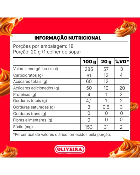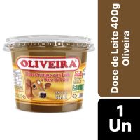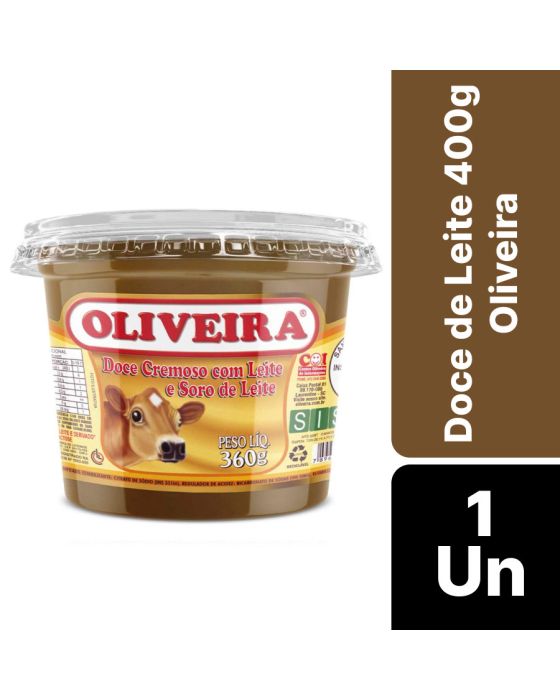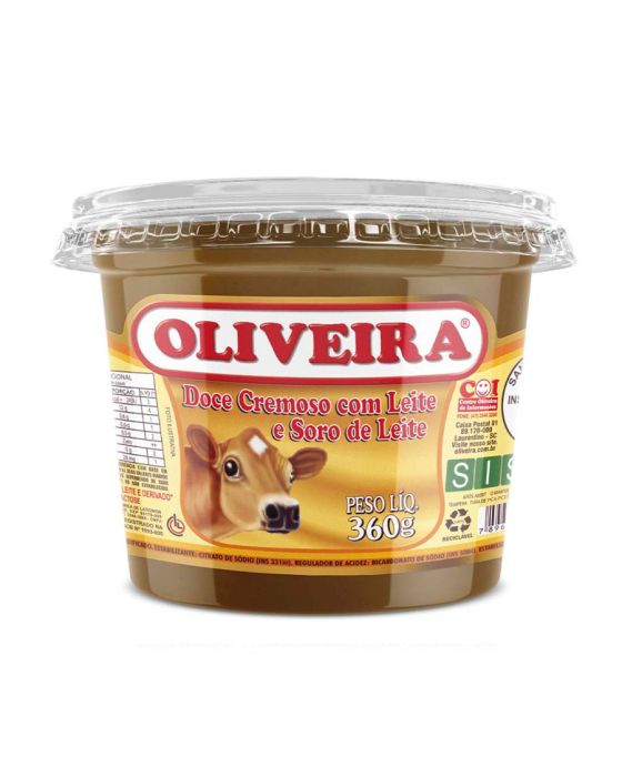 Características:O Café da manhã ou da trade, ou até mesmo aquele lanche no intervalo do trabalho ficará ainda mais saboroso com o Doce de Leite Oliveira, desfrute do sabor púnico e marcante, feito com leite puro e fresco e 60% leite, que proporcionam uma experiência de sabor autêntica, memorável e cremosa.Detalhes:- Marca: Oliveira;- Linha: Doces;- Tipo: Pote;- Sabor: Doce de leite;- Peso: 360g;- Contém: 1 unidade do produto;- Cremosidade e sabor aos melhores paladares;- Produzido com leite puro e fresco;- Com 60% de leite- Tradicional;- Cremoso e saboroso.Indústria Brasileira. | Validade: 10 meses após a data de fabricação impressa na embalagem;Ideal para:- Ideal para refeitórios, copas, e ambientes corporativos que servem café da manhã, café da tarde e lanche aos colaboradores, além de ser um item para cestas presenteáveis.Ingredientes:- Leite, Açúcar, Soro de Leite em Pó, Glicose de milho, amido de milho modificado, Estabilizante: Citrato de sódio (INS 331iii), Regulador de acidez: Bicarbonato de sódio(INS 500iii), Estabilizante: Pectina (INS 440), Conservador: sorbato de potássio (INS 202) e Enzima (lactase). Conservação:- Manter em local seco, arejado e inodoro;- Após aberto, manter sob refrigeração na temperatura de 1°C a 17°c e consumir em até 30 dias.Medidas:- Dimensões do produto: 10,5 x 10,5 x 8,2cm (CxLxA);- Peso: 360g.ALÉRGICOS: CONTÉM LEITE E DERIVADOS.CONTÉM LACTOSE. NÃO CONTÉM GLÚTEN.* As especificações podem ser alteradas sem aviso prévio ** Imagem meramente ilustrativa.