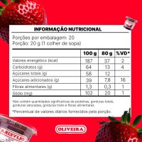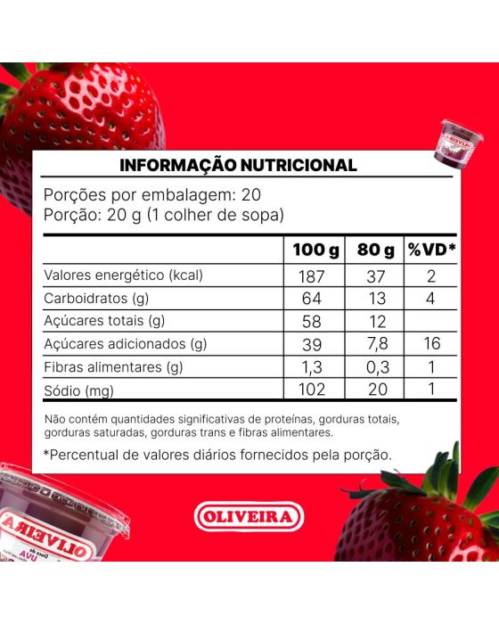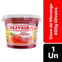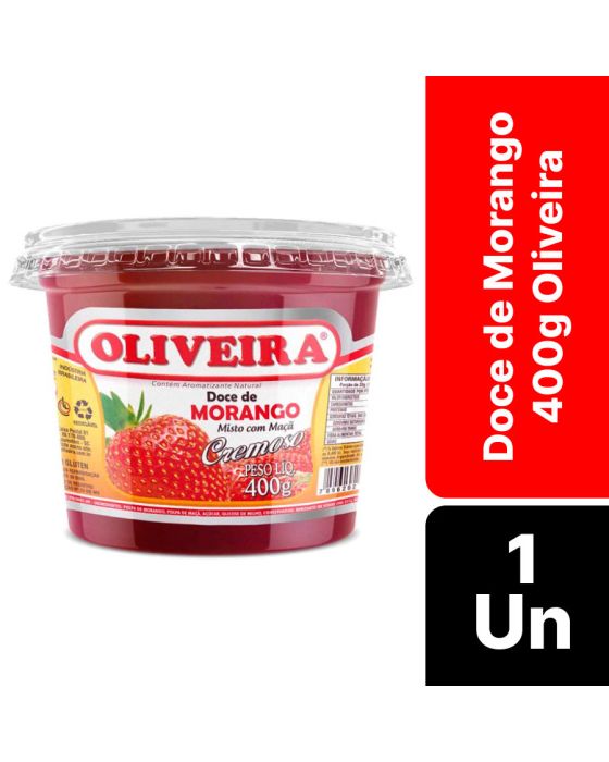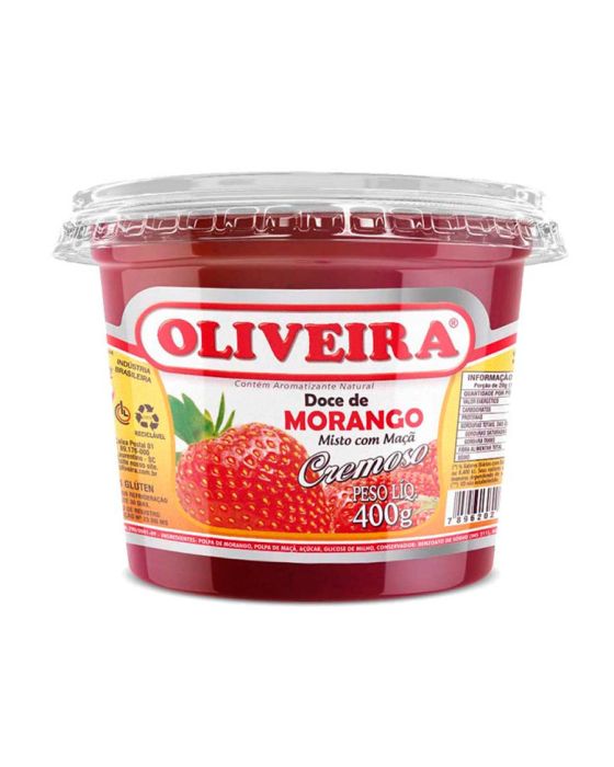 Características:O Café da manhã ou da trade, ou até mesmo aquele lanche no intervalo do trabalho ficará ainda mais saboroso com o Doce de Morango Oliveira, desfrute do sabor púnico e marcante, feito com frutas frescas e selecionadas, que proporcionam uma experiência de sabor autêntica e memorável.Detalhes:- Marca: Oliveira;- Linha: Doces;- Tipo: Pote;- Sabor: Morango;- Peso: 400g;- Contém: 1 unidade do produto;- Tradição regional;- Frutas selecionadas;- Menos açúcar, mais sabor;- Misto com maça.Indústria Brasileira. | Validade: 12 meses após a data de fabricação impressa na embalagem;Ideal para:- Ideal para refeitórios, copas, e ambientes corporativos que servem café da manhã, café da tarde e lanche aos colaboradores, além de ser um item para cestas presenteáveis.Ingredientes:- Polpa de morango, Polpa de maça, Açúcar, Glicose de milho geneticamente modificado (espécies doadoras: Agrobacterium tumefaciens, Bacillus thuringiensis, Sphingobium herbicidoravans, Streptpmyces viridochromogenes e Zea mays), Conservador: Benzoato INS 211, Acidulante: ácido fosfórico INS 338 e Aromatizante natural de morango.Conservação:- Manter em local seco, arejado e inodoro;- Após aberto, manter sob refrigeração e consumir em até 30 dias.Medidas:- Dimensões do produto: 10,5 x 10,5 x 8,2cm (CxLxA);- Peso: 400g.ALÉRGICOS: NÃO CONTÉM GLÚTEN.* As especificações podem ser alteradas sem aviso prévio ** Imagem meramente ilustrativa.