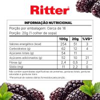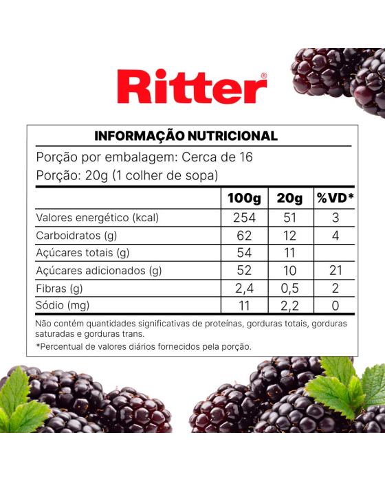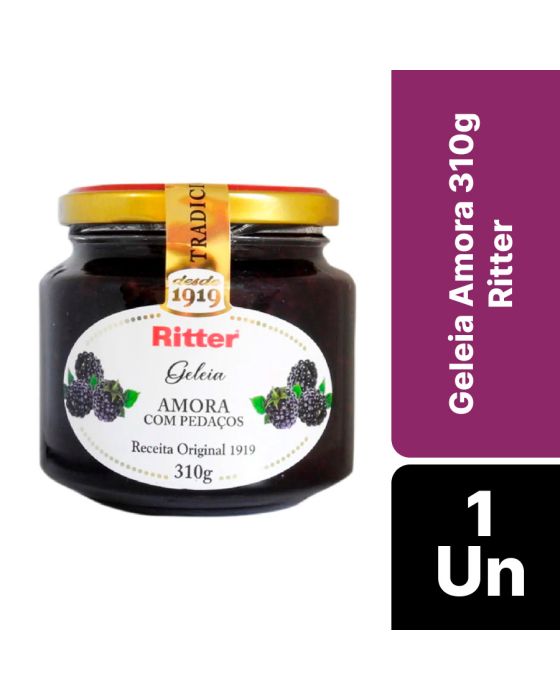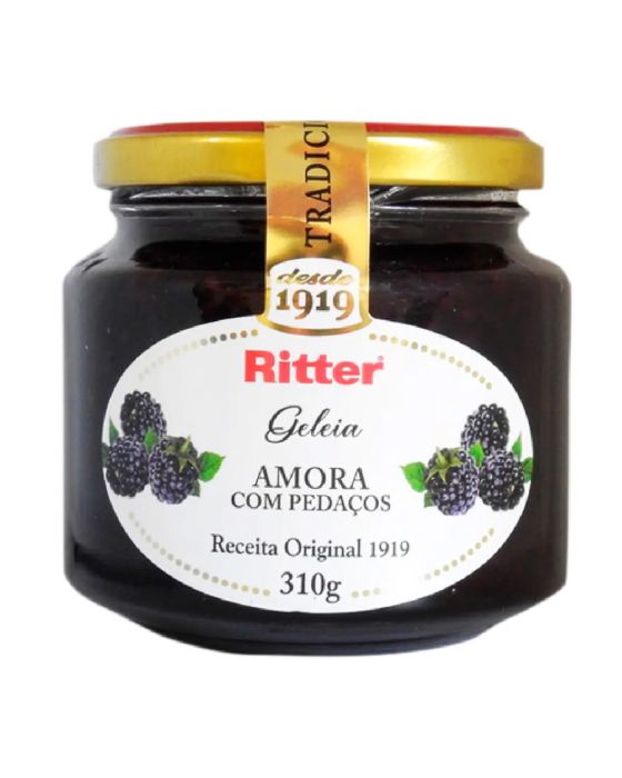 Características:- Geleia de amora com textura encorpada e sabor frutado autêntico: A Geleia de Amora Ritter 310 g é elaborada a partir de uma receita tradicional, valorizando o sabor intenso e naturalmente levemente ácido da amora.- Elaboração tradicional com pedaços da fruta: Produzida conforme a Receita Original Ritter 1919, a geleia contém pedaços de amora, o que contribui para uma textura mais rica e artesanal. Esse processo garante melhor percepção de sabor e consistência, reforçando a identidade do produto e sua aplicação em preparações doces e gastronômicas.- Versatilidade para consumo diário e composições culinárias: Indicada para o café da manhã, café da tarde ou lanches, pode ser utilizada com pães, torradas, bolos, queijos, iogurtes e sobremesas. - Sobre a marca Ritter: A Ritter Alimentos é uma marca brasileira com mais de um século de história, reconhecida pela produção de geleias, conservas e alimentos de alta qualidade.- Ingredientes: Amora, açúcar, glicose, estabilizante pectinas, acidulante ácido lático, conservante sorbato de potássio.- Informação nutricional e alergênicos:Não contém glúten. Não contém lactose.- Dimensões da embalagem: Comprimento: 8,5cm; Largura: 8,5cm; Altura: 8,5cm; Peso: 502g.* As especificações podem ser alteradas sem aviso prévio ** Imagem meramente ilustrativa.