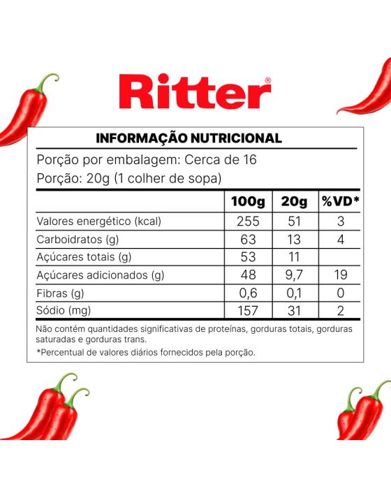 Características:- Geleia gourmet com perfil equilibrado e intenso: A Geleia Gourmet Pimenta Vermelha Ritter é elaborada a partir da Chilli Pepper, entregando um perfil sensorial marcante, com ardência equilibrada e notas adocicadas características de uma geleia gourmet. - Textura homogênea e aplicação versátil na gastronomia: Com consistência ideal para espalhar e servir, a geleia apresenta textura uniforme, facilitando o uso tanto em preparações frias quanto quentes. É indicada para harmonizações que exigem contraste entre doce e picante, mantendo estabilidade e sabor mesmo após o preparo.- Indicada para acompanhamentos, harmonizações e receitas especiais: Versátil, pode ser utilizada em pães, torradas, queijos, sanduíches, tábuas frias, carnes grelhadas, molhos e sobremesas gourmet. É uma excelente opção para cafés da manhã diferenciados, cafés da tarde, lanches sofisticados e composições gastronômicas criativas.- Embalagem prática com receita tradicional: A embalagem em vidro com 310 g preserva o sabor, a textura e a qualidade do produto, além de facilitar o armazenamento e o manuseio. A receita segue o padrão tradicional da marca, garantindo consistência e confiabilidade no consumo.- Sobre a marca Ritter: A Ritter Alimentos é uma marca brasileira com mais de um século de história, reconhecida pela produção de geleias, conservas e alimentos de alta qualidade.- Ingredientes: Açúcar, glicose, suco concentrado de maçã, pimenta, sal, estabilizante pectinas, conservante sorbato de potássio e acidulante ácido cítrico.- Informação nutricional e alergênicos:Não contém glúten. Não contém lactose.- Dimensões da embalagem: Comprimento: 8,5cm; Largura: 8,5cm; Altura: 8,5cm; Peso: 502g.* As especificações podem ser alteradas sem aviso prévio ** Imagem meramente ilustrativa.