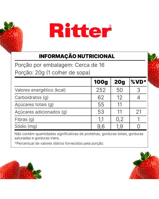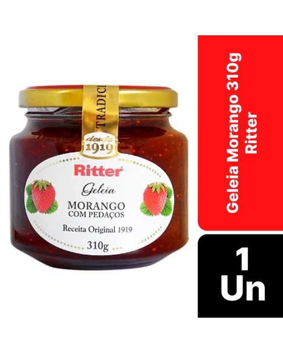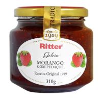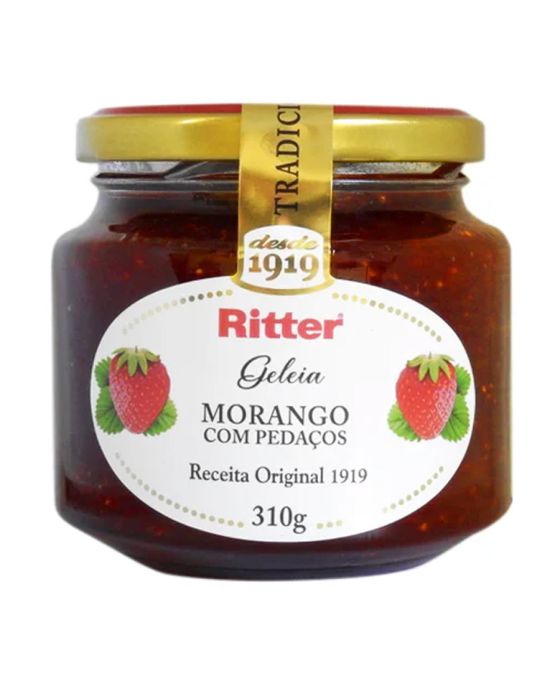 Características:- Geleia de morango com pedaços e textura encorpada: A Geleia de Morango com Pedaços Ritter é elaborada a partir de uma receita tradicional que valoriza o sabor natural da fruta e a presença de pedaços inteiros, proporcionando textura diferenciada e perfil sensorial equilibrado entre doçura e acidez. - Versatilidade para consumo diário e aplicações gastronômicas: Indicada para o café da manhã, café da tarde ou lanches em geral, a geleia pode ser utilizada em pães, torradas, bolos, waffles e sobremesas, além de harmonizar muito bem com queijos, iogurtes e preparações culinárias doces.- Receita original com padrão de qualidade consolidado: Produzida segundo a Receita Original 1919, a Geleia Ritter mantém um padrão rigoroso de qualidade, sabor e textura, refletindo a tradição da marca na produção de geleias e conservas. O envase em pote de vidro de 310 g preserva o produto e facilita o armazenamento e o uso no dia a dia.- Sobre a marca Ritter: A Ritter Alimentos é uma marca brasileira com mais de um século de história, reconhecida pela produção de geleias, conservas e alimentos de alta qualidade.- Ingredientes: Morango, açúcar, glicose, estabilizante pectinas, acidulante ácido lático e conservante sorbato e potássio.- Informação nutricional e alergênicos:Não contém glúten. Não contém lactose.- Dimensões da embalagem: Comprimento: 8,5cm; Largura: 8,5cm; Altura: 8,5cm; Peso: 502g.* As especificações podem ser alteradas sem aviso prévio ** Imagem meramente ilustrativa.