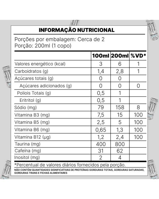 Características:- Energia leve e refrescante: O Energético Monster Ultra Sem Açúcar 473ml foi desenvolvido para quem busca desempenho e foco com uma sensação mais leve e sabor suave. Sua fórmula equilibrada oferece energia instantânea sem açúcar e com apenas 6 kcal, ideal para acompanhar treinos, estudos, longas jornadas de trabalho ou momentos de lazer, garantindo disposição sem excesso de calorias.- Sabor cítrico e estímulo eficiente: Com 62mg de cafeína por lata, o Monster Ultra proporciona estímulo mental e físico moderado, mantendo a vitalidade e a concentração. Seu sabor cítrico e refrescante diferencia-se dos energéticos tradicionais, tornando-o uma ótima opção para quem prefere uma experiência mais suave e menos doce, sem abrir mão da energia característica da marca.- A potência da marca Monster: A Monster Energy é líder global em bebidas energéticas e símbolo de ousadia e performance. Reconhecida pela alta qualidade de suas fórmulas e conexão com esportes, música e lifestyle urbano, a marca oferece produtos que combinam energia, estilo e autenticidade.- Ingredientes: Água gaseificada, taurina (800mg/200ml), cafeína (62mg/200ml), vitaminas (B3, B5, B6 e B12), extrato de guaraná (4,0mg/200ml), inositol (4,0mg/200ml), maltodextrina, reguladores de acidez (Ácido cítrico, Citrato de sódio), edulcorantes artificiais (Eritritol, Sucralose, Acesulfame de potássio), aromatizantes naturais e artificiais, conservadores (Ácido sórbico e Ácido benzóico).- Informação nutricional e alergênicos:Não contém glúten. Não contém lactose.- Dimensões do produto: Comprimento: 7cm; Largura: 7cm; Altura: 16cm; Peso: 492g.* As especificações podem ser alteradas sem aviso prévio ** Imagem meramente ilustrativa.