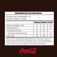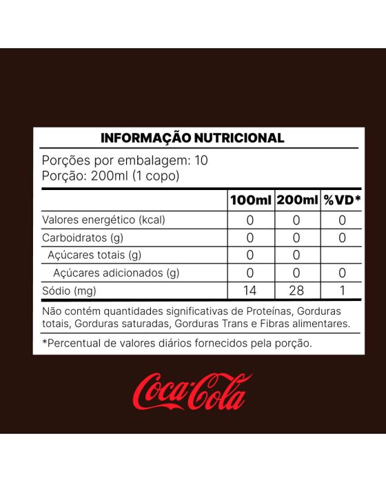 Características:- Sabor original com zero açúcar: O Refrigerante Coca-Cola Sem Açúcar PET 2L oferece o mesmo sabor inconfundível da Coca-Cola tradicional, mas sem adição de açúcar, ideal para quem busca equilíbrio entre prazer e bem-estar. Sua fórmula combina o clássico sabor da marca com adoçantes de alta qualidade, garantindo refrescância e leveza em cada gole, sem comprometer o sabor característico.- Refrescância ideal para todos os momentos: Com gás na medida certa e sabor intenso, a Coca-Cola Sem Açúcar é perfeita para acompanhar refeições, encontros entre amigos, eventos corporativos e momentos de lazer. Sua embalagem de 2 litros proporciona praticidade para o consumo compartilhado, mantendo a bebida fresca e com excelente carbonatação até o último copo.- Praticidade e conservação: A garrafa PET de 2L é resistente e leve, facilitando o transporte e o armazenamento em diferentes ambientes. Além disso, o fechamento com tampa rosqueável mantém a integridade e a efervescência do refrigerante após aberto, garantindo mais durabilidade e conveniência no dia a dia.- Aplicações versáteis: É uma excelente opção para empresas que desejam oferecer uma bebida refrescante, saborosa e reconhecida mundialmente em seus ambientes corporativos. Ideal para restaurantes, lanchonetes, buffets, hotéis, eventos empresariais, conveniências e áreas de alimentação em indústrias e escritórios, proporciona uma experiência agradável aos colaboradores, clientes e visitantes. - Marca icônica e compromisso com a qualidade: A Coca-Cola é uma das marcas mais reconhecidas e admiradas do mundo, símbolo de sabor, qualidade e tradição.- Ingredientes: Água gaseificada, extratode noz de cola, cafeína, aroma natural, corante caramelo IV, acidulante ácido fosfórico, edulcorantes ciclamato de sódio (27mg), acesulfame de potássio (15mg), easpartame (12mg) por100ml, conservador benzoato de sódio e estabiizante citrato trissódico.- Informação nutricional e alergênicos:Não contém glúten. Contém fenilalanina.Alérgicos: Contém derivados de leite e soja. Pode conter trigo, cevada, aveia, centeio, amendoim amêndoa, avelãs, nozes, castanha-e-caju, castanha-do-pará e coco.- Dimensões da embalagem: Comprimento: 10cm; Largura: 10cm; Altura: 34,5cm; Peso: 2,011kg.* As especificações podem ser alteradas sem aviso prévio ** Imagem meramente ilustrativa.