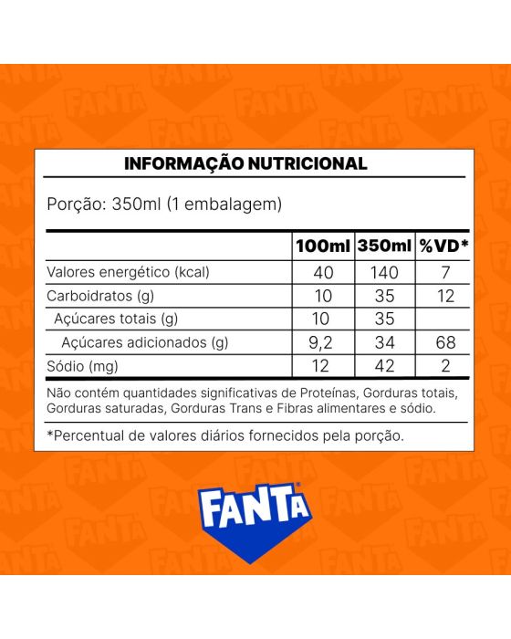 Características:- Refrigerante gaseificado com sabor intenso e refrescante de laranja: O Refrigerante Fanta Laranja 350ml foi desenvolvido para proporcionar uma experiência refrescante, com sabor marcante e borbulhante característico da fruta. Sua formulação combina gás na medida certa, dulçor equilibrado e 5,25% de suco de laranja, resultando em uma bebida leve, vibrante e amplamente aceita pelo consumidor brasileiro.- Embalagem prática em lata para consumo individual: A lata de 350 ml oferece praticidade e conveniência para consumo imediato, sendo ideal para acompanhar a rotina diária. - Perfil sensorial frutado com identidade clássica: Reconhecida pelo sabor autêntico e intenso de laranja, a Fanta Laranja entrega um perfil sensorial equilibrado entre acidez e doçura. Sua composição com suco de fruta reforça a percepção natural do sabor, tornando cada gole refrescante e agradável.- Indicado para consumo direto, refeições e momentos de lazer: Versátil, pode ser consumida bem gelada, como acompanhamento de refeições, lanches, encontros informais e momentos de descontração. - Sobre a marca Fanta: A Fanta é uma marca globalmente reconhecida por sua inovação e diversidade de sabores no segmento de refrigerantes.- Ingredientes: Água gaseificada, açúcar, suco concentrado de laranja (4,20%), suco concentrado de maçã (1,00%), reguladores de acidez ácido cítrico e citrato trissódico, aromatizante, conservadores benzoato de sódio e sorbato de potássio e corante amarelo crepúsculo FCF.- Informação nutricional e alergênicos:Não contém glúten. Não contém lactose.- Dimensões do produto: Comprimento: 6cm;Largura: 6cm;Altura: 12,2cm;Peso: 372g.* As especificações podem ser alteradas sem aviso prévio ** Imagem meramente ilustrativa.
