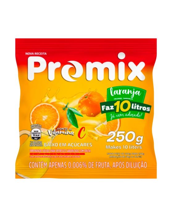 Caracteristicas:Excelente rendimento apresentado em 10 sabores para compartilhar com os amigos e família, porque sempre tem um bom motivo para comemorar. Promix traz praticidade, rendimento, refrescância e sabor para matar a sede de todos.Detalhes:- Marca: Promix.- Linha: Refresco em pó.- Sabor: Laranja.- Peso: 250g.- Faz: 10 Litros.- Excelente custo-benefício.– Melhor balanço sensorial com polpa de fruta.- Já vem adoçado na medida certa– Melhor rendimento e fácil dissolução.– Baixo teor de sódio.– Fonte de vitamina C.– Apenas 19Kcal por copo.Modo de preparo:Para 1 Litro:- Misture bem duas colheres de sopa cheias do produto em 1 litro de água fria ou gelada.- Bebida para consumo imediato.Para 10 Litros:- Misture o conteúdo desta embalagem em 10 litros de água fria ou gelada.- Bebida para consumo imediato.- Para melhor resultado em porções fracionadas, recomenda-se misturar o pó no pacote antes de cada uso.Ingredientes:- Açúcar, vitamina C (ácido ascórbico), polpa de laranja desidratada, acidulante ácido cítrico, edulcorantes: ciclamato de sódio (23mg/100ml), aspartame (9mg/100ml), acessulfame de potássio (4,1mg/100ml) e sacarina sódica (1,5mg/100ml), aromatizante, antiumectantes: fosfato tricálcico e dióxido de silício, corante inorgânico dióxido de titânio, regulador de acidez citrato de sódio, espessantes: goma xantana e carboximetilcelulose sódica, corantes artificiais: tartrazina e amarelo crepúsculo FCF, corante caramelo IV.* As especificações podem ser alteradas sem aviso prévio ** Imagem meramente ilustrativa.