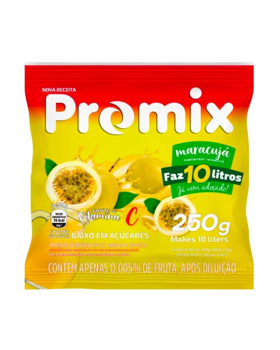 Caracteristicas:Excelente rendimento apresentado em 10 sabores para compartilhar com os amigos e família, porque sempre tem um bom motivo para comemorar. Promix traz praticidade, rendimento, refrescância e sabor para matar a sede de todos.Detalhes:- Marca: Promix.- Linha: Refresco em pó.- Sabor: Maracujá.- Peso: 250g.- Faz: 10 Litros.- Excelente custo-benefício.– Melhor balanço sensorial com polpa de fruta.- Já vem adoçado na medida certa– Melhor rendimento e fácil dissolução.– Baixo teor de sódio.– Fonte de vitamina C.– Apenas 19Kcal por copo.Modo de preparo:Para 1 Litro:- Misture bem duas colheres de sopa cheias do produto em 1 litro de água fria ou gelada.- Bebida para consumo imediato.Para 10 Litros:- Misture o conteúdo desta embalagem em 10 litros de água fria ou gelada.- Bebida para consumo imediato.- Para melhor resultado em porções fracionadas, recomenda-se misturar o pó no pacote antes de cada uso.Ingredientes:- Açúcar, vitamina C (ácido ascórbico), polpa de maracujá desidratada, acidulante ácido cítrico, edulcorantes: ciclamato de sódio (24mg/100ml), aspartame (10mg/100ml), acessulfame de potássio (6mg/100ml) e sacarina sódica (1mg/100ml), antiumectantes: fosfato tricálcico e dióxido de silício, corante inorgânico dióxido de titânio, regulador de acidez citrato de sódio, aromatizante, espessantes: goma xantana e carboximetilcelulose sódica e corantes artificiais: tartrazina e amarelo crepúsculo FCF.* As especificações podem ser alteradas sem aviso prévio ** Imagem meramente ilustrativa.