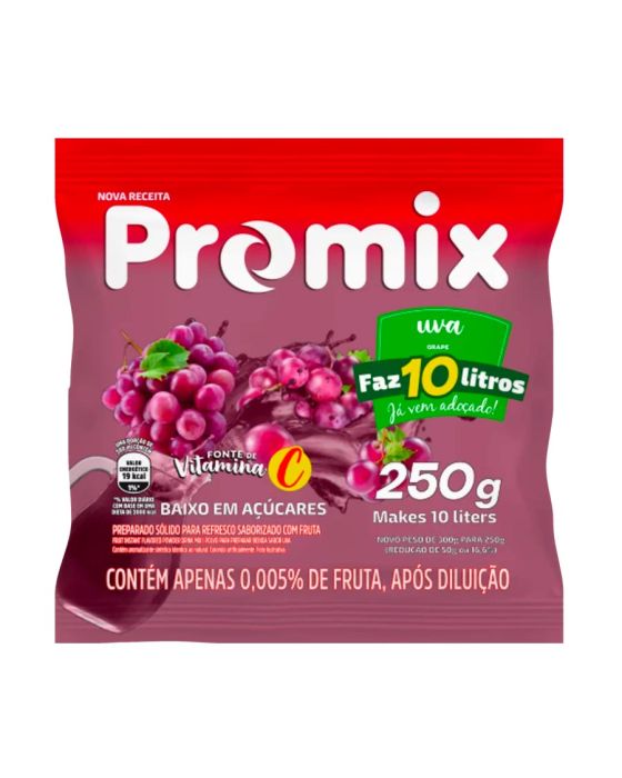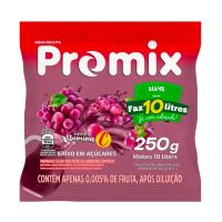 Caracteristicas:Excelente rendimento apresentado em 10 sabores para compartilhar com os amigos e família, porque sempre tem um bom motivo para comemorar. Promix traz praticidade, rendimento, refrescância e sabor para matar a sede de todos.Detalhes:- Marca: Promix.- Linha: Refresco em pó.- Sabor: Uva.- Peso: 250g.- Faz: 10 Litros.- Excelente custo-benefício.– Melhor balanço sensorial com polpa de fruta.- Já vem adoçado na medida certa– Melhor rendimento e fácil dissolução.– Baixo teor de sódio.– Fonte de vitamina C.– Apenas 19Kcal por copo.Modo de preparo:Para 1 Litro:- Misture bem duas colheres de sopa cheias do produto em 1 litro de água fria ou gelada.- Bebida para consumo imediato.Para 10 Litros:- Misture o conteúdo desta embalagem em 10 litros de água fria ou gelada.- Bebida para consumo imediato.- Para melhor resultado em porções fracionadas, recomenda-se misturar o pó no pacote antes de cada uso.Ingredientes:- Açúcar, vitamina C (ácido ascórbico), polpa de uva desidratada, acidulante ácido cítrico, edulcorantes: ciclamato de sódio (20mg/100ml), aspartame (7,5mg/100ml), acessulfame de potássio (6,6mg/100ml) e sacarina sódica (1mg/100ml), reguladores de acidez: citrato de sódio e ácido fumárico, antiumectantes: fosfato tricálcico e dióxido de silício, espessantes: goma xantana e carboximetilcelulose sódica, aromatizante, corante inorgânico dióxido de titânio e corantes artificiais: bordeaux S, tartrazina, vermelho 40 e azul brilhante FCF.* As especificações podem ser alteradas sem aviso prévio ** Imagem meramente ilustrativa.