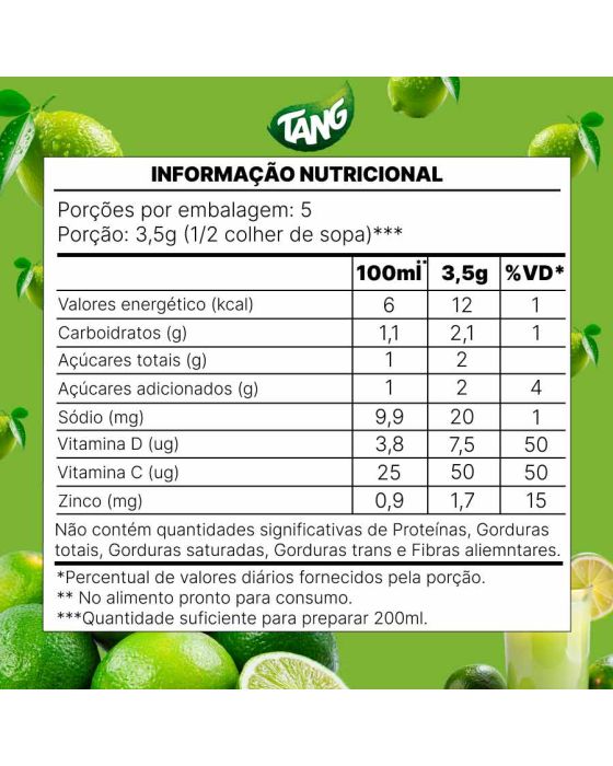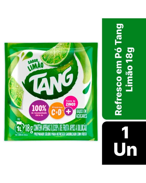 Características:- Refresco nutritivo e prático: Tang Limão 18g é um refresco em pó com nova fórmula que oferece 100% da recomendação diária de vitamina C e D em dois copos preparados, além de ser fonte de zinco — nutrientes que contribuem para a imunidade e o bom funcionamento do organismo. Ideal para o consumo diário.- Fácil preparo e bom rendimento: Basta dissolver o sachê em 1 litro de água fria ou gelada. O produto já vem adoçado e possui baixo teor de açúcares, dispensando a adição de açúcar.- Sabor cítrico e refrescante: Com sabor leve de limão, o refresco oferece uma bebida cítrica e equilibrada, ideal para dias quentes ou para acompanhar refeições. A nova fórmula melhora a solubilidade do pó e proporciona melhor textura.- Marca reconhecida pela qualidade: Tang é uma marca tradicional no segmento de refrescos em pó, conhecida pela inovação constante em sabores e fórmulas nutricionalmente otimizadas.- Ingredientes: Açúcar, maltodextrina, vitamina C, suco de limão desidratado, sulfato de zinco, vitamina D, acidulante ácido cítrico, antiumectantes: fosfato tricálcico e dióxido de silício, edulcorantes: aspartame (22mg/100ml), ciclamato de sódio (16mg/100ml), acesulfame de potássio (3,3mg/100ml) e sacarina sódica (1,6mg/100ml), regulador de acidez citrato trissódico, aromatizante, corantes: dióxido de titênio, tartrazina e amarelo crepúsculo FCF e espumante extrato de quilaia.- Informação nutricional e alergênicos:Não contém glúten. Alérgicos: Pode conter Leite. Fenilcetonúricos: Contém fenilalanina.- Dimensões do produto:Comprimento: 8,7cmLargura: 9,1cm;Altura: 0,5cm;Peso: 18g.* As especificações podem ser alteradas sem aviso prévio ** Imagem meramente ilustrativa.