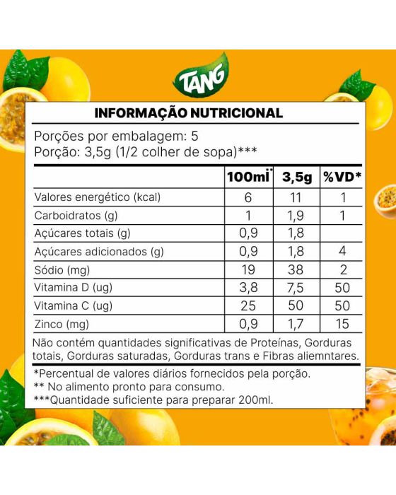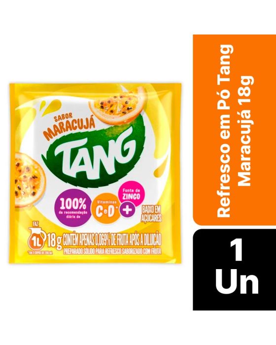 Características:- Refresco prático com vitaminas e baixo teor de açúcares: Tang Maracujá 18g é uma bebida em pó com nova fórmula que fornece 100% da recomendação diária de vitamina C e D em apenas dois copos. Também é fonte de zinco, auxiliando na imunidade e no bom funcionamento do organismo. Uma opção prática e nutritiva para o dia a dia.- Preparo fácil e rendimento ideal: Basta dissolver o sachê em 1 litro de água fria ou gelada. O produto já vem adoçado e possui baixo teor de açúcares, dispensando a adição de açúcar.- Sabor leve com fórmula aprimorada Com sabor suave de maracujá, o refresco oferece uma bebida leve e refrescante. A nova fórmula melhora a dissolução do pó, garantindo melhor textura e consistência.- Marca reconhecida pela qualidade: Tang é uma marca tradicional no segmento de refrescos em pó, conhecida pela inovação constante em sabores e fórmulas nutricionalmente otimizadas.- Ingredientes: Açúcar, maltodextrina, vitamina C, suco de maracujá desidratado, sulfato de zinco, vitamina D, acidulante ácido cítrico, espessantes: goma guar e goma xantana, regulador de acidez citrato trissódico, antiumectantes: fosfato tricálcico e dióxido de silício, edulcorantes: aspartame (27mg/100ml), ciclamato de sódio (15mg/100ml), acesulfame de potássio (3,0mg/100ml) e sacarina sódica (1,6mg/100ml), aromatizante, corantes: dióxido de titênio, tartrazina e amarelo crepúsculo FCF e espumante extrato de quilaia.- Informação nutricional e alergênicos:Não contém glúten. Alérgicos: Pode conter Leite. Fenilcetonúricos: Contém fenilalanina.- Dimensões do produto:Comprimento: 8,7cmLargura: 9,1cm;Altura: 0,5cm;Peso: 18g.* As especificações podem ser alteradas sem aviso prévio ** Imagem meramente ilustrativa.