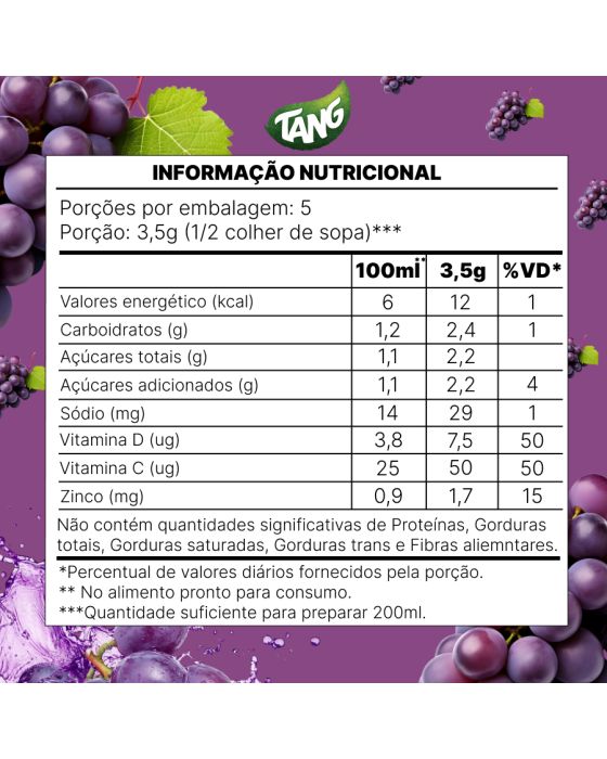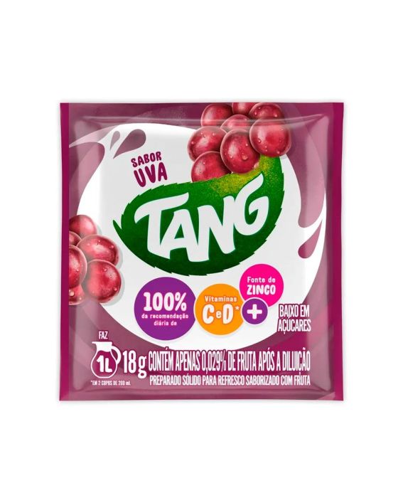 Características:- Bebida prática com vitaminas e baixo teor de açúcares: Tang Uva 18g é um refresco em pó com nova fórmula, que oferece 100% da recomendação diária de vitamina C e D em apenas dois copos preparados. Também é fonte de zinco, contribuindo para a imunidade e o bom funcionamento do corpo. Uma opção prática e nutritiva para toda a família.- Fácil preparo e ótimo rendimento: Basta misturar o conteúdo do sachê em 1 litro de água filtrada, fria ou gelada. O produto já vem adoçado, não sendo necessário adicionar açúcar. Com baixo teor de açúcares, é ideal para o consumo diário.- Sabor intenso com qualidade garantida: Com sabor marcante de uva e excelente solubilidade, a nova formulação garante uma bebida mais consistente e agradável, pronta para qualquer momento do dia.- Marca reconhecida pela qualidade: Tang é uma marca tradicional no segmento de refrescos em pó, conhecida pela inovação constante em sabores e fórmulas nutricionalmente otimizadas.- Ingredientes: Açúcar, maltodextrina, suco de uva desidratado, vitamina C, sulfato de zinco, vitamina D, acidulante ácido cítrico, reguladores de acidez: ácido fumárico e citrato trissódico, edulcorantes: aspartame (27mg), ciclamato de sódio (27mg/100ml), acesulfame de potássio (3,8mg/100ml) e sacarina sódica (1,9mg/100ml), antiumectante fosfato tricálcico, espessantes: gomas guar e xantana, corantes: vermelho 40, bordeaux S, dióxido de titânio e azul brilhante FCF, aromatizante e espumante extrato de quilaia.- Informação nutricional e alergênicos:Não contém glúten. Alérgicos: Pode conter Leite. Fenilcetonúricos: Contém fenilalanina.- Dimensões do produto:Comprimento: 8,7cmLargura: 9,1cm;Altura: 0,5cm;Peso: 18g.* As especificações podem ser alteradas sem aviso prévio ** Imagem meramente ilustrativa.