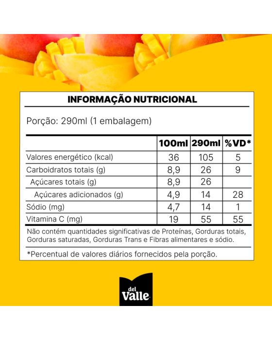 Características:- Néctar de manga com alto teor de fruta e perfil sensorial equilibrado: O Suco Del Valle Néctar Manga 290ml foi desenvolvido para oferecer uma bebida refrescante com sabor autêntico e textura suave. Sua formulação contém 50% de suco ou polpa de fruta, combinando a doçura natural da manga com equilíbrio e paladar agradável, ideal para consumo diário.- Embalagem em lata prática para consumo individual: A lata de 290 ml proporciona praticidade e portabilidade, sendo adequada para consumo imediato em diferentes rotinas.- Textura aveludada e sabor natural de manga: Com consistência leve e fácil de beber, o néctar apresenta perfil sensorial suave e sabor característico da fruta. A composição inclui suco de maçã e adição de vitamina C, contribuindo para uma experiência mais equilibrada e nutritiva, sem conservantes artificiais.- Indicado para hidratação, refeições e momentos de pausa: Versátil, o Del Valle Néctar Manga pode ser consumido puro, bem gelado, como acompanhamento de refeições, lanches, intervalos de trabalho, estudos ou momentos de lazer.- Sobre a marca Del Valle: A Del Valle é uma marca amplamente reconhecida no segmento de sucos e néctares, destacando-se pela qualidade, seleção de frutas e compromisso com formulações equilibradas.- Ingredientes: Água, Polpa De Manga (Mínimo 58%), Açúcar, Acidulante Ácido Cítrico E Aroma Natural.- Informação nutricional e alergênicos:Não contém glúten. Não contém lactose.- Dimensões do produto: Comprimento: 6cm;Largura: 6cm;Altura: 12,2cm;Peso: 372g.* As especificações podem ser alteradas sem aviso prévio ** Imagem meramente ilustrativa.