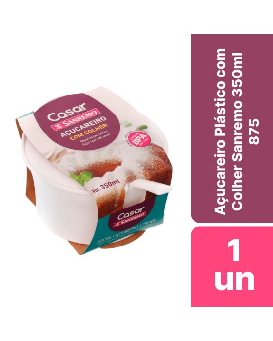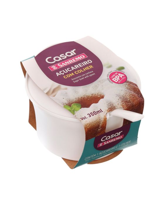 Características:Açucareiro com design moderno e clean. Possui tampa e colher garantindo um produto que leva praticidade e beleza para a sua mesa ou copa.Detalhes:- Marca: Sanremo;- Modelo: Casar;- Referência: 875;- Linha: Açucareiros;- Cor: Branco;- Capacidade: 350ml;- Contém: 1 unidade do produto;- Possui colher;- Produto Atóxico, livre de BPA;- Design moderno;- Material de alta qualidade;- Fácil de lavar.Ideal para:- Armazenamento de Açúcar e similares.Composição: - Fabricado em Plástico.Medidas:- Dimensões do produto: 12,2 x 11 x 7,2cm (CxLxA);- Peso: 110g.* As especificações podem ser alteradas sem aviso prévio ** Imagem meramente ilustrativa.