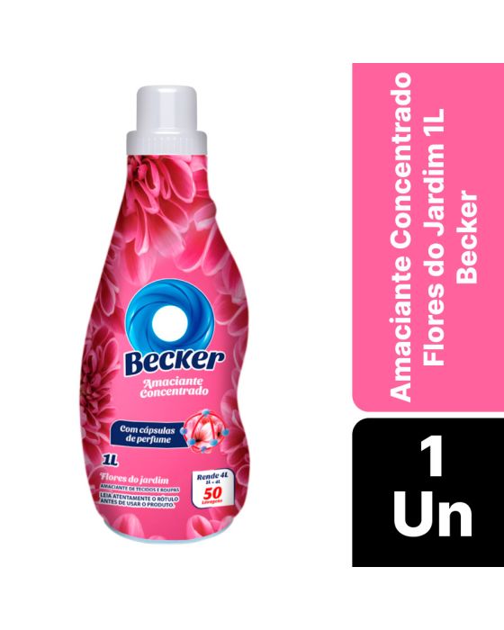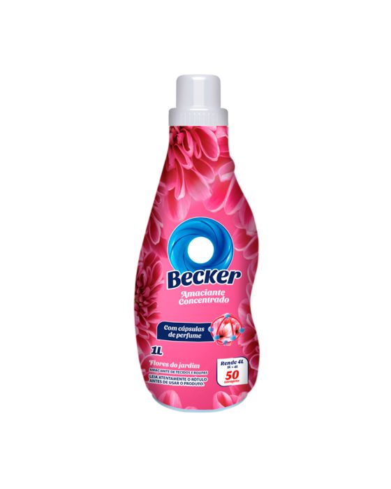 Características:- Maciez e perfume prolongado em cada lavagem: O Amaciante Concentrado Flores do Jardim 1L Becker proporciona suavidade e frescor às roupas, deixando-as agradáveis ao toque e com perfume duradouro. Sua fórmula concentrada garante alto rendimento, sendo ideal para lavanderias profissionais, hotéis, hospitais, indústrias têxteis e empresas de limpeza que buscam qualidade e economia nos processos de higienização têxtil.- Fórmula concentrada e eficiente: Com apenas 1 litro, o produto rende até 4 litros de amaciante diluído, equivalente a aproximadamente 50 lavagens. Sua composição contém cápsulas de perfume que liberam fragrância gradualmente, prolongando a sensação de frescor nas roupas. Além disso, o amaciante reduz o atrito entre as fibras, facilitando o passar e contribuindo para maior conservação dos tecidos.- Proteção contra odores e desgaste: O Becker Flores do Jardim conta com tecnologia que forma uma camada protetora nas fibras do tecido, bloqueando o mau odor e evitando o acúmulo de cheiros indesejados. Essa ação prolonga a vida útil das roupas e mantém a sensação de limpeza por mais tempo, mesmo em ambientes de uso intenso.- Composição e função técnica dos ingredientes: A formulação contém metil sulfato de dialquiléster hidroximetil metil amônio, espessante, coadjuvante, fragrância, conservante, corante e veículo. Essa combinação entrega maciez, proteção contra odores e controle de aplicação em processos industriais e comerciais.- Ideal para uso profissional: Recomendado para empresas que realizam higienização de uniformes, roupas de cama e enxovais, o amaciante Becker é uma escolha prática e econômica para lavanderias, redes hoteleiras, clínicas e prestadoras de serviços de limpeza. Sua dosagem simples, meia tampinha (20ml) por lavagem, facilita o controle de consumo e otimiza os custos operacionais.- Marca de tradição e confiança: A Becker é reconhecida no mercado de limpeza e cuidados têxteis pela qualidade e eficiência de seus produtos.- Dimensões do produto:Comprimento: 10cm; Largura: 4,5cm; Altura: 26,7cm; Peso: 1,08kg.IMPORTANTE! CONSERVAR FORA DO ALCANCE DAS CRIANÇAS E DOS ANIMAIS DOMÉSTICOS.* As especificações podem ser alteradas sem aviso prévio ** Imagem meramente ilustrativa.