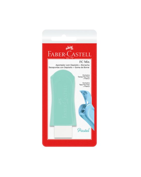 Características:O apontador FC Mix Pastel vem com borracha integrada no mesmo produto para oferecer mais praticidade e conveniência. O FC Mix Pastel conta com um sistema de fechamento que impede a saída de resíduos e uma capa protetora na borracha para evitar a sujeira. Detalhes:- Marca: Faber-Castell;- Modelo: FC Mix Pastel Mix;- Referência: SM/124BORPASTELZF;- Linha: Apontadores e Borrachas;- Cor: Azul pastel, Rosa pastel, Roxo pastel e Verde pastel (Cores sortidas);- Quantidade de furos: 1 furo;- Contém: 1 unidade do produto;- 2 em 1: Apontador com depósito e Borracha;- Exclusiva tampa flip flop mais prático- Cores suaves;- Design exclusivo.Cores sortidas, será enviado de acordo com a disponibilidade do estoque. Não é possível escolher uma cor específica.* As especificações podem ser alteradas sem aviso prévio ** Imagem meramente ilustrativa