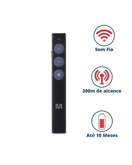 Características:Com o Apresentador Sem Fio AC285 Multi, você terá mais praticidade e eficácia para fazer as suas apresentações, tudo na palma da sua mão! Conta com conexão em entrada USB, ponto de luz vermelho com alcance de 200m para fixação melhor no ponto a ser apresentado, 3 botões emborrachados para controle da sua apresentação, botão liga e desliga na parte lateral para evitar que você esbarre o dedo no meio da apresentação, além disso ele vem com 1 pilha AAA.Detalhes:- Marca: Multi;- Referência: AC285;- Linha: Apresentadores;- Tipo: Sem fio;- Cor: Preto com detalhes em cinza;- Cor do laser: Vermelho;- Contém: 1 unidade do produto;- Quantidade de botões: 3 botões;- Alimentação: 1 Pilhas AAA (Inclusas);- Autonomia da bateria: até 10 meses (Até 10 meses sem laser e 4 meses com laser);- Alcance do Laser: 200m;- Distância de Leitura: Até 10m do Receptor USB;- Tecnologia Sem Fio: 2.4 GHz;- Funções multimidias: Avançar, Retornar e Laser Vermelho;- Design compacto e leve.Conexão:- Tipo de conexão: Mini receptor USB Plug and Play.Software:- Software: Power Point, Media Player e outros.Compatibilidade:- Compatibilidade: Windows 10 ou superior, Linux e MacOS.Alimentação:- 1 Pilhas AAA (Inclusas);Botões:- Avançar;- Retornar;- Laser Vermelho;- Liga/Desliga.Composição:- Fabricado em plástico e componentes eletrônicos.Medidas:- Dimensões do produto: 13 x 3,8 x 2,8cm (CxLxA);- Dimensões da caixa: 21,3 x 13,5 x 7,5cm (CxLxA);- Peso: 96g.Conteúdo da embalagem: 1 Apresentador sem fio 2.4 gHz, 1 receptor USB, 1 pilha AAA e 1 Manual.Garantia do fornecedor: 3 anos contra defeitos de fabricação.* As especificações podem ser alteradas sem aviso prévio ** Imagem meramente ilustrativa.