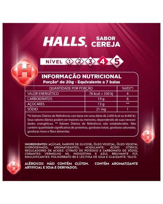 CaracterísticasHalls é bala mais consumida do Brasil! Sua formulação possui mentol, que garante uma poderosa sensação de refrescância e respiração profunda, para você se sentir pronto para encarar qualquer desafio. Disponível em deliciosos sabores, Halls é a bala perfeita para o dia-a-dia e também para momentos de curtição com a galera. Sua embalagem é prática e fácil de carregar no bolso ou na mochila para ter Halls sempre com você!- Sabor: Cereja- 28g- Ingredientes: Açúcar, xarope de glicose, óleo vegetal, óleo vegetal hidrogenado, aromatizantes, acidulante ácido citrico, reguladores de acidez: citrato de potassio e carbonato de sodio, corantes: vermelho 40, indigotina e azul brilhante FCF, emulsificantes: polisorbato 80 e lecitina de soja e glaceante talco.* As especificações podem ser alteradas sem aviso prévio** Imagem meramente ilustrativa.