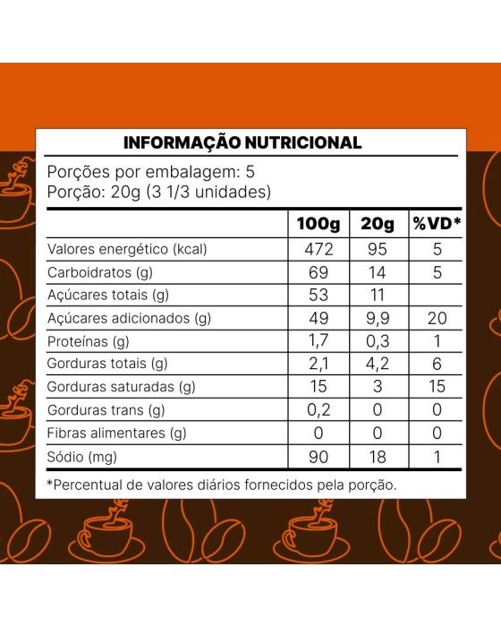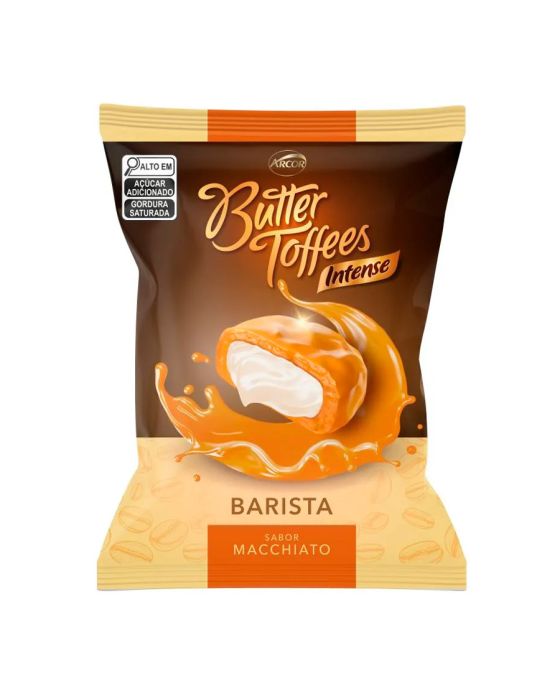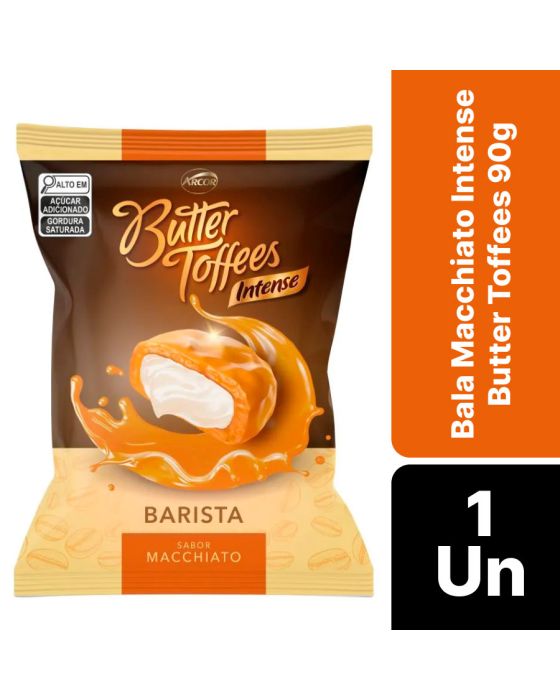 Características:A Bala Butter Toffes Intense Barista Macchiato possui cobertura de caramelo de leite e recheio de creme de caramelo salgado e é ideal para os amantes de cafés e caramelo salgado. Sua textura leve e recheio cremoso fazem com que o sabor espalhe pela boca!Detalhes:- Marca: Butter Toffes;- Fabricante: Arcor;- Modelo: Barista Intense Macchiato;- Linha: Balas;- Sabor: Macchiato (Caramelos de leite recheados com creme sabor caramelo salgado);- Peso: 90g;- Contém: 1 unidade do produto com 90g;- Cobertura: Caramelo de leite;- Recheio: Caramelo Macchiato.Indústria Brasileira.Ingredientes:- Xarope de Glicose, Açúcar, Leite Condensado, Óleo Vegetal de Palmiste Hidrogenado, Gordura Vegetal, Manteiga, Óleo Vegetal de Soja, Soro de Leite em Pó, Permeado de Soro de Leite em Pó, Leite Integral em Pó, Sal, Aromatizante e Emulsificantes: Lecitina de soja, Mono e Diglicerídeos de Ácidos Graxos e Ésteres de Poliglicerol com Ácido Ricinoléico Interesterificado.Conservação:- Mantenha em local fresco e seco.Medidas:- Dimensões da embalagem: 18,5 x 15 x 2,5cm (CxLxA);- Peso: 112g.ALÉRGICOS: CONTÉM DERIVADOS DE LEITE, SOJA E PODE CONTER TRIGO, CEVADA, AVEIA, CENTEIO, AMENDOIM, AMÊNDOA, AVELÃS, NOZES, CASTANHA-DE-CAJU, CASTANHA-DO-PARÁ E COCO.CONTÉM GLÚTEN. CONTÉM LACTOSE. CONTÉM AROMATIZANTE.* As especificações podem ser alteradas sem aviso prévio** Imagem meramente ilustrativa.